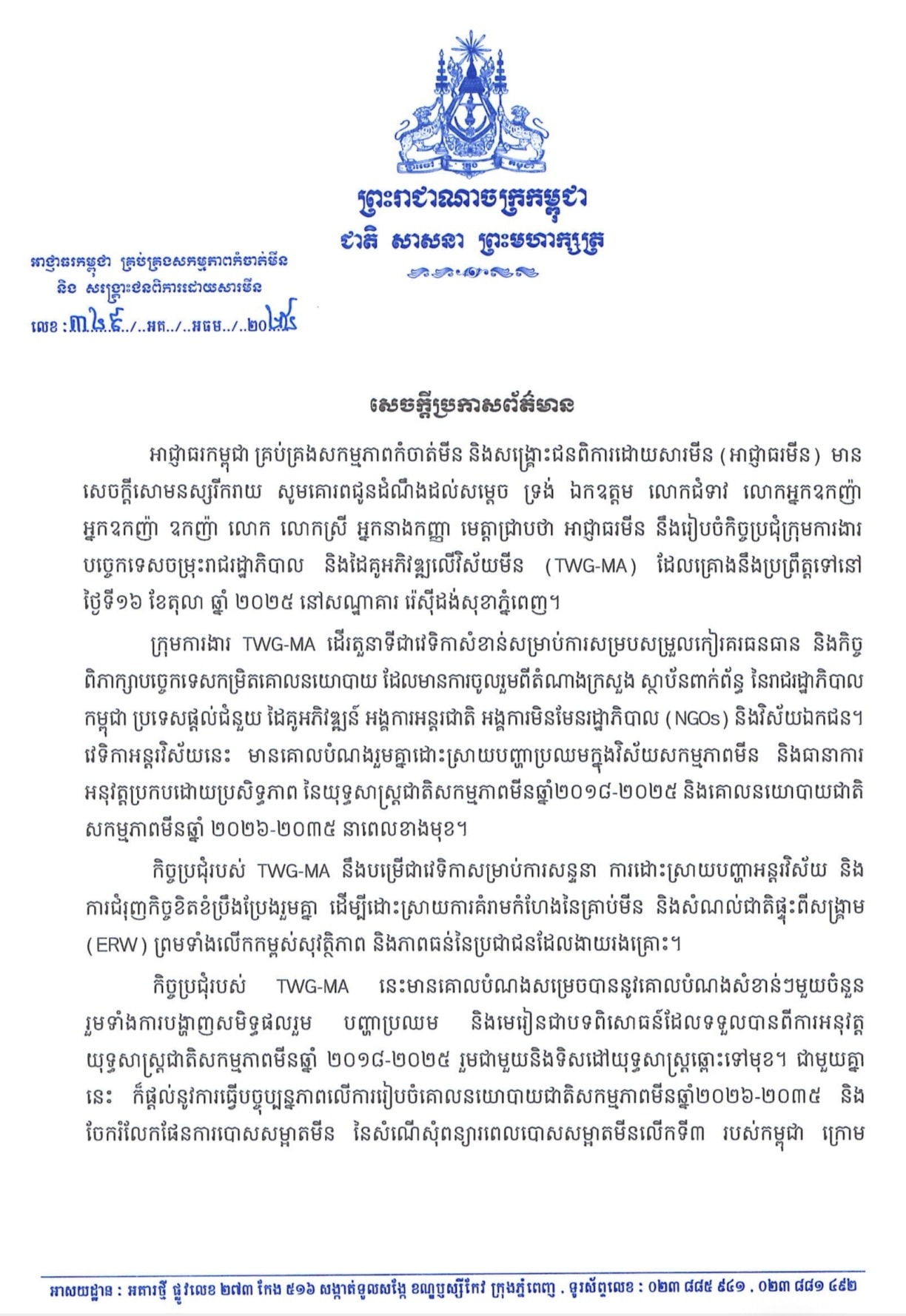 នៅថ្ងៃទី១៤ ខែតុលា ឆ្នាំ២០២៥ អាជ្ញាធរកម្ពុជា គ្រប់គ្រងសកម្មភាពកំចាត់មីន និងសង្គ្រោះជនពិការដោយសារមីន (អាជ្ញាធរមីន) បានចេញផ្សាយសេចក្តីប្រកាសព័ត៌មានជម្រាបដល់សាធារណជន អំពីការរៀបចំកិច្ចប្រជុំក្រុមការងារបច្ចេកទេសចម្រុះរាជរដ្ឋាភិបាល និងដៃគូអភិវឌ្ឍលើវិស័យមីន (TWG-MA) ដែលគ្រោងនឹងប្រព្រឹត្តទៅនៅថ្ងៃទី១៦ ខែតុលា ឆ្នាំ២០២៥ នៅសណ្ឋាគារ រ៉េស៊ីដង់សុខាភ្នំពេញ។