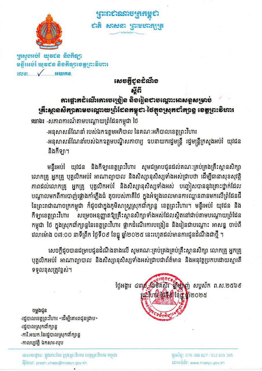សេចក្តីជូនដំណឹងស្តីពីការផ្អាកដំណើរការបង្រៀន និងរៀនជាបណ្តោះអាសន្នសម្រាប់គ្រឹះស្ថានសិក្សាតាមបណ្តោយព្រំដែនកម្ពុជា-ថៃក្នុងស្រុកជាំក្សាន្ត ខេត្តព្រះវិហារ