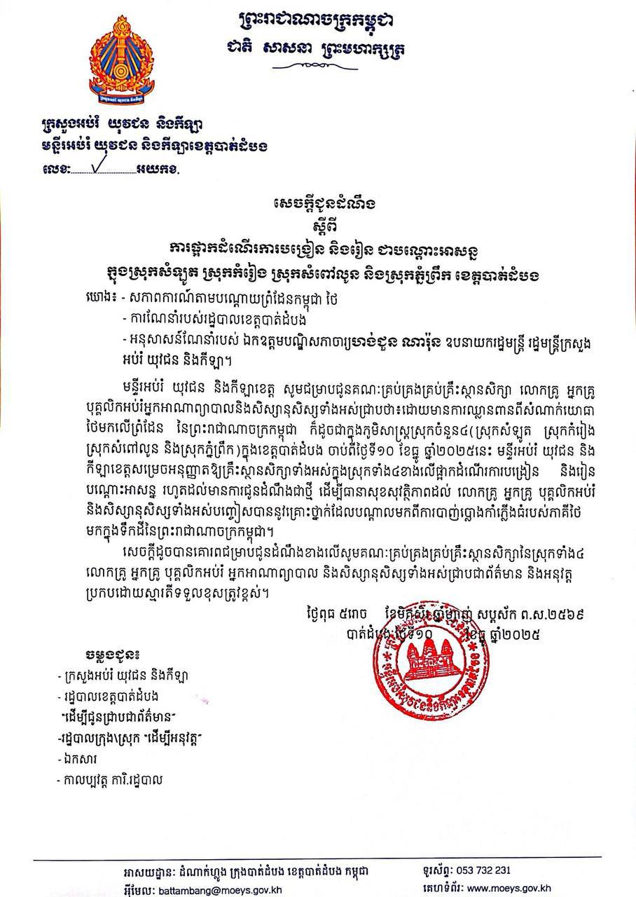 សេចក្តីជូនដំណឹងស្តីពីការផ្អាកដំណើរការបង្រៀន និងរៀន ជាបណ្តោះអាសន្ន ក្នុងស្រុកសំឡូត ស្រុកកំរៀង ស្រុកសំពៅលូន និងស្រុកភ្នំព្រឹក ខេត្តបាត់ដំបង