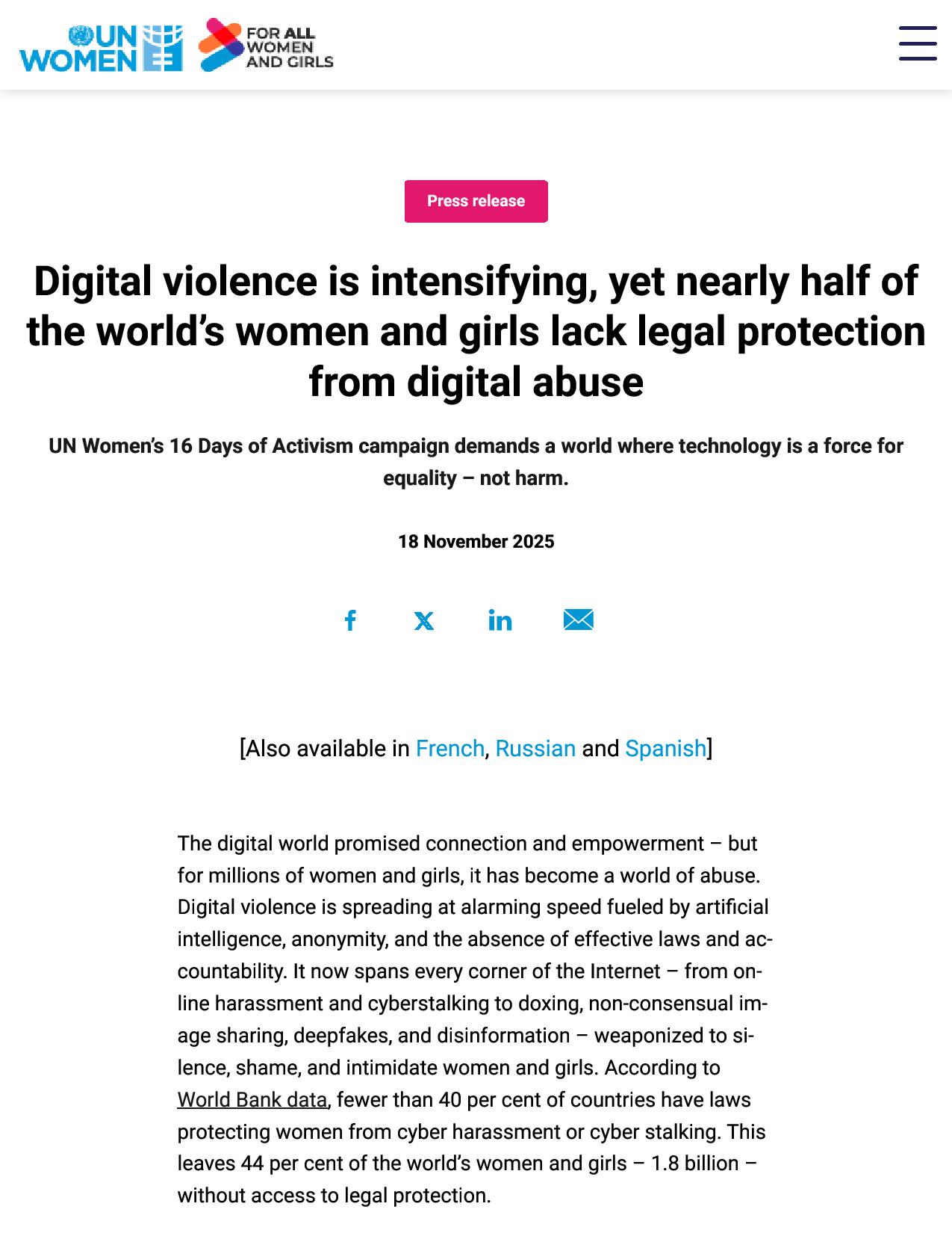 នៅថ្ងៃទី១៨ ខែវិច្ឆិកា ឆ្នាំ២០២៥ អង្គការ UN Women បានចេញសេចក្តីប្រកាសព័ត៌មានមួយដោយគូសបញ្ជាក់ថា អំពើហិង្សាតាមប្រព័ន្ធឌីជីថលប្រឆាំងនឹងស្ត្រី និងក្មេងស្រីកំពុងកើនឡើងយ៉ាងឆាប់រហ័ស ខណៈដែលជិតពាក់កណ្តាលនៃចំនួនប្រជាជន ...