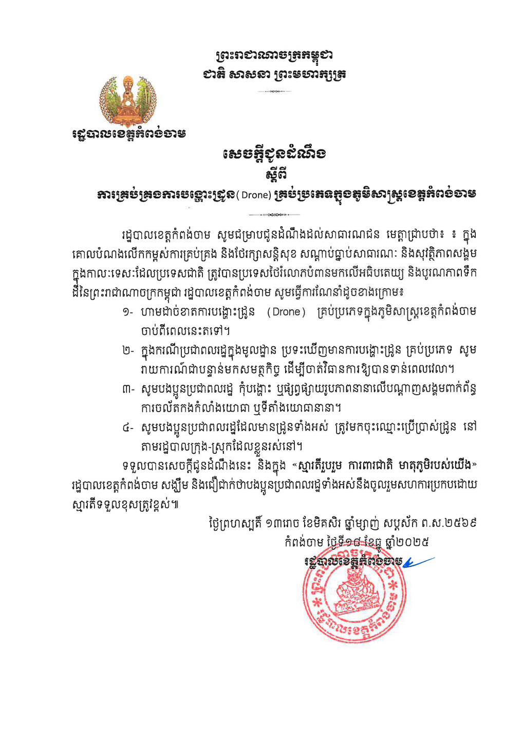 សេចក្តីជូនដំណឹង​ ស្តី​ពី​ការ​គ្រប់គ្រង​ការ​បង្ហោះ​ដ្រូ​ន​ (Drone)​ គ្រប់​ប្រភេទ​ក្នុងភូមិ​សាស្ត្រ​ខេត្តកំពង់ចាម​