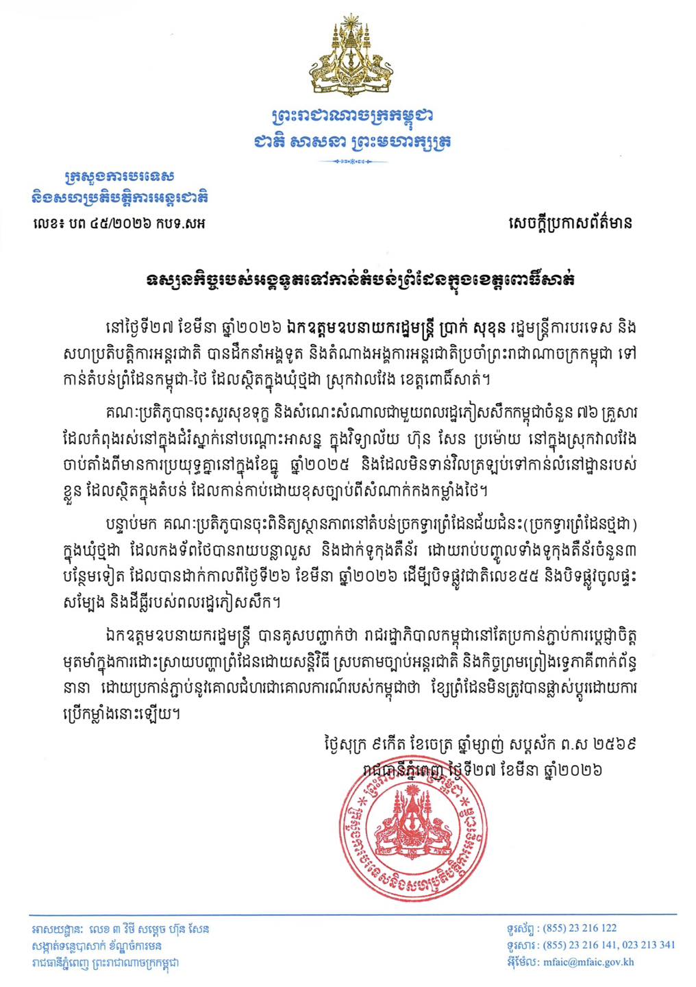 នៅថ្ងៃទី២៧ ខែមីនា ឆ្នាំ២០២៦ ក្រសួងការបរទេស និងសហប្រតិបត្តិការអន្តរជាតិ បានចេញសេចក្តីប្រកាសព័ត៌មានស្តីពីដំណើរទស្សនកិច្ចរបស់កងកម្លាំងការទូតទៅកាន់តំបន់ព្រំដែនខេត្តពោធិ៍សាត់។គណៈប្រតិភូបានទៅជួបគ្រួសារខ្មែរដែលផ្លាស់ទីលំនៅចំនួន ៧៦ គ្រួសារ ដែលបានរស់នៅក្នុងជម្រកបណ្តោះអាសន្ននៅវិទ្យាល័យហ៊ុនសែនប្រម៉ោយ ស្រុកវាលវែង ចាប់តាំងពីការប្រយុទ្ធគ្នាក្នុងខែធ្នូ ឆ្នាំ២០២៥ ហើយនៅតែមិនអាចត្រឡប់ទៅផ្ទះរបស់ពួកគេវិញនៅក្នុងតំបន់ដែលកងកម្លាំងថៃកាន់កាប់ដោយខុសច្បាប់។ ...