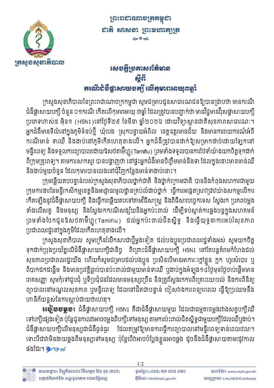 នៅថ្ងៃទី៣១ ខែមីនា ឆ្នាំ២០២៦ ក្រសួងសុខាភិបាល បានចេញសេចក្តីប្រកាសព័ត៌មាន ស្តីពីករណីជំងឺផ្តាសាយបក្សីលើកុមារា អាយុ៣ឆ្នាំ នៅខេត្តឧត្តរមានជ័យ។ក្រសួងសុខាភិបាលនៃព្រះរាជាណាចក្រកម្ពុជា សូមជម្រាបជូនសាធារណជនឱ្យបានជ្រាបថា មានករណី ជំងឺផ្តាសាយបក្សី ចំនួន ០១ករណី កើតលើកុមារាអាយុ ៣ឆ្នាំ ដែលត្រូវបានបញ្ជាក់ថា មានវិជ្ជមានវីរុសផ្តាសាយបក្សី ប្រភេទហាស់៥ អ៊ុន១ (H5N1) នៅថ្ងៃទី២៩ ខែមីនា ឆ្នាំ២០២៦ ដោយវិទ្យាស្ថានជាតិសុខភាពសាធារណៈ។ ...