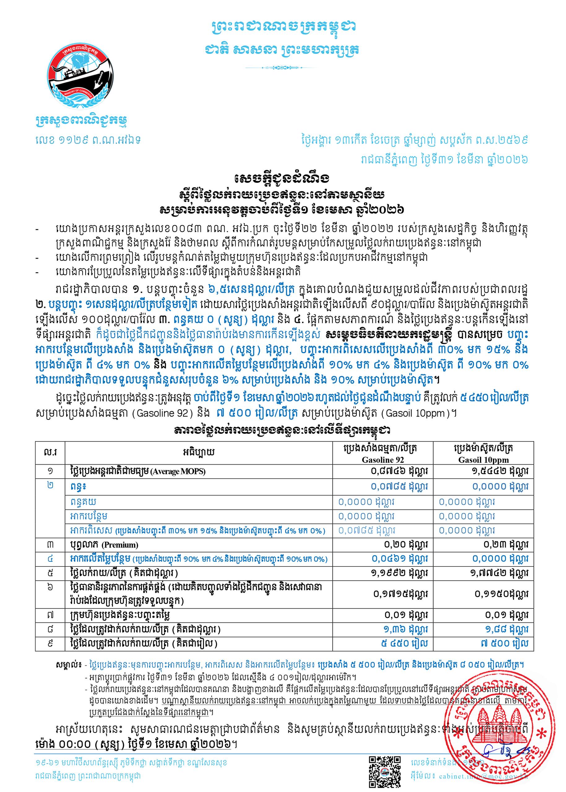 នៅថ្ងៃទី២៥ ខែមីនា ឆ្នាំ២០២៦ ក្រសួងពាណិជ្ជកម្ម បានចេញសេចក្តីជូនដំណឹង ស្តីពីថ្លៃលក់រាយប្រេងឥន្ធនៈនៅតាមស្ថានីយ សម្រាប់ការអនុវត្តចាប់ពីថ្ងៃទី២៦ ខែមីនា ឆ្នាំ២០២៦។សេចក្តីជូនដំណឹងនេះបានបញ្ជាក់ថា តម្លៃលក់រាយប្រេងសាំងធម្មតា (Gasoline 92) គឺ ៥,៤៥០ រៀល ...