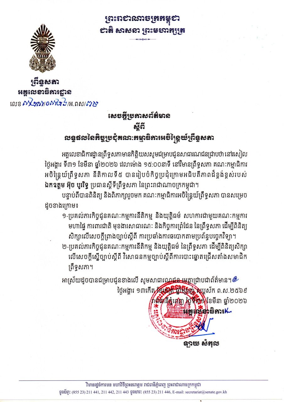 នៅថ្ងៃទី៣១ ខែមីនា ឆ្នាំ២០២៦ អគ្គលេខាធិការដ្ឋានព្រឹទ្ធសភា បានចេញសេចក្តីប្រកាសព័ត៌មានស្តីពីលទ្ធផលនៃកិច្ចប្រជុំគណៈកម្មាធិការអចិន្ត្រៃយ៍ព្រឹទ្ធសភា។សេចក្តីប្រកាសនេះបានបញ្ជាក់ថា គណៈកម្មាធិការអចិន្ត្រៃយ៍ព្រឹទ្ធសភា បានសម្រេចប្រគល់ភារកិច្ចឱ្យគណៈកម្មការពាក់ព័ន្ធ ពិនិត្យ និងសិក្សាលើសេចក្តីព្រាងច្បាប់ ...