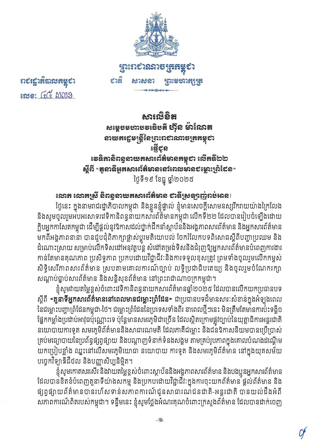 សារលិខិត៖ សម្តេចមហាបវរធិបតី ហ៊ុន ម៉ាណែត នាយករដ្ឋមន្ត្រីនៃព្រះរាជាណាចក្រកម្ពុជា ផ្ញើជូន វេទិកានិពន្ធនាយកសារព័ត៌មានកម្ពុជា លើកទី២២ ស្តីពី “តួនាទីអ្នកសារព័ត៌មាននៅពេលមានជម្លោះព្រំដែន” ថ្ងៃទី១៩ ខែធ្នូ ឆ្នាំ២០២៥