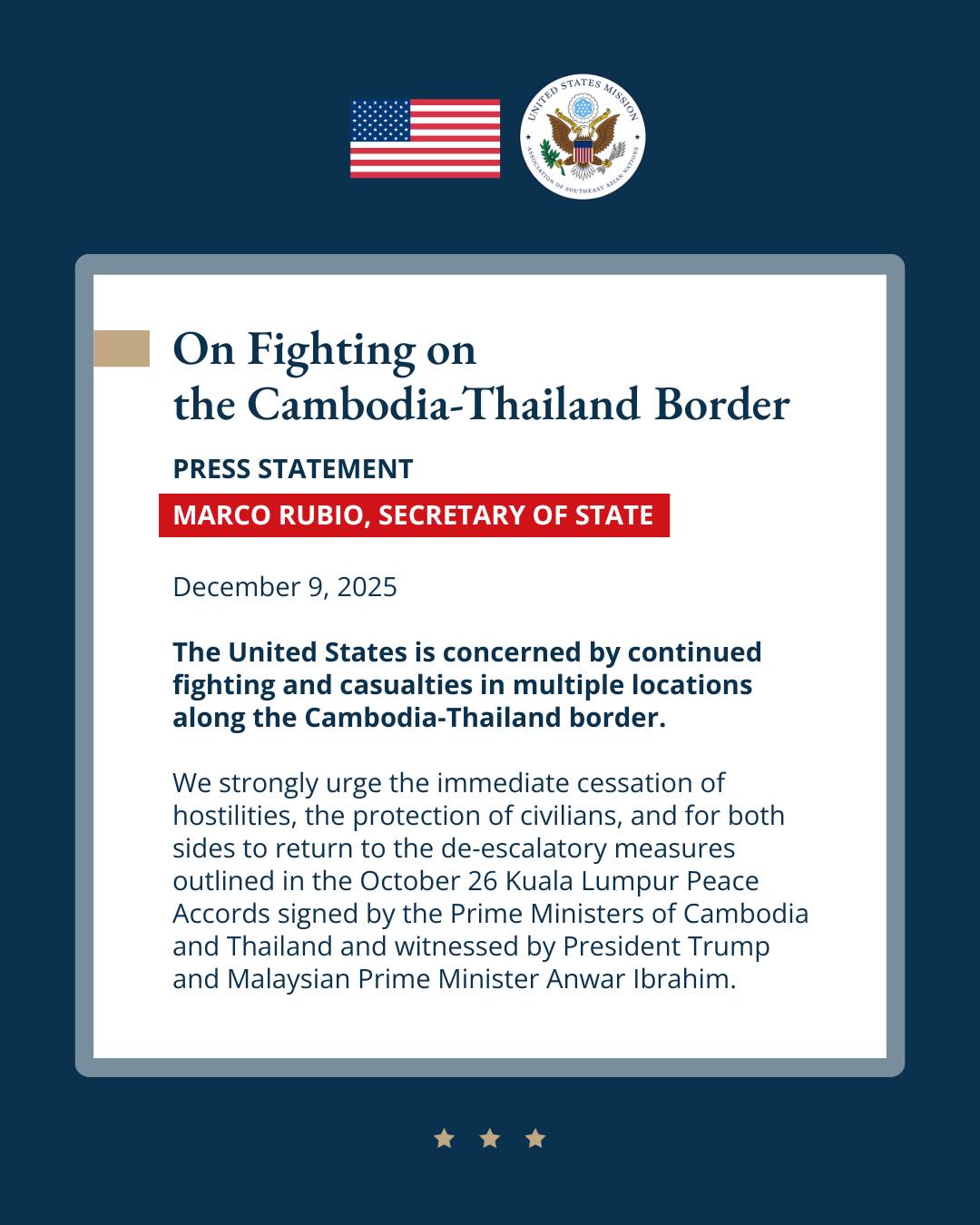 នៅថ្ងៃទី៩ ខែធ្នូ ឆ្នាំ២០២៥ ស្ថានបេសកកម្មសហរដ្ឋអាមេរិកប្រចាំនៅអាស៊ាន បានចេញសេចក្តីថ្លែងការណ៍បង្ហាញពីក្តីបារម្ភចំពោះការបន្តការប្រយុទ្ធគ្នា និងការបាត់បង់ជីវិតនៅតាមទីតាំងជាច្រើនតាមបណ្តោយព្រំដែនកម្ពុជា-ថៃ។ សហរដ្ឋអាមេរិកបាន ...