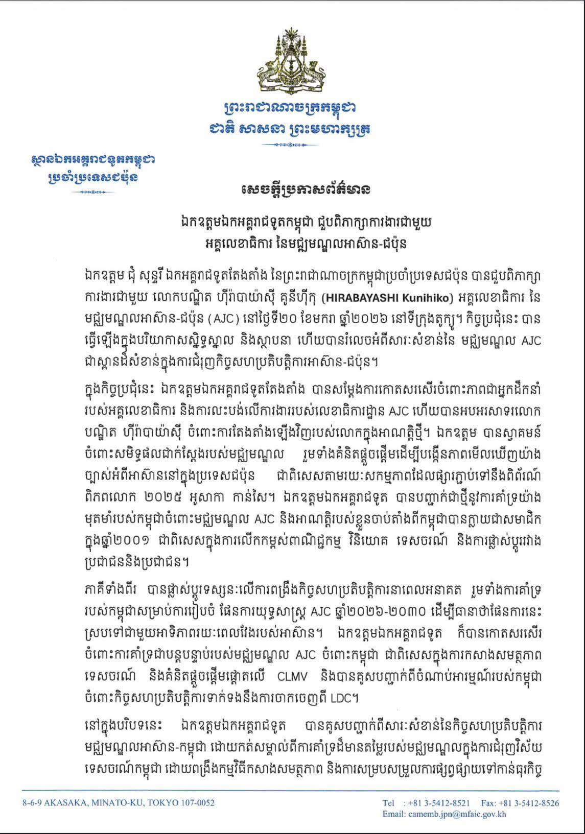 នៅថ្ងៃទី២០ ខែមករា ឆ្នាំ២០២៦ ស្ថានឯកអគ្គរាជទូតកម្ពុជាប្រចាំប្រទេសជប៉ុន បានចេញសេចក្តីប្រកាសព័ត៌មាន ស្តីពី ការជួបពិភាក្សាការងាររវាង ឯកឧត្តមឯកអគ្គរាជទូតកម្ពុជា និងអគ្គលេខាធិការនៃមជ្ឈមណ្ឌលអាស៊ាន-ជប៉ុន។