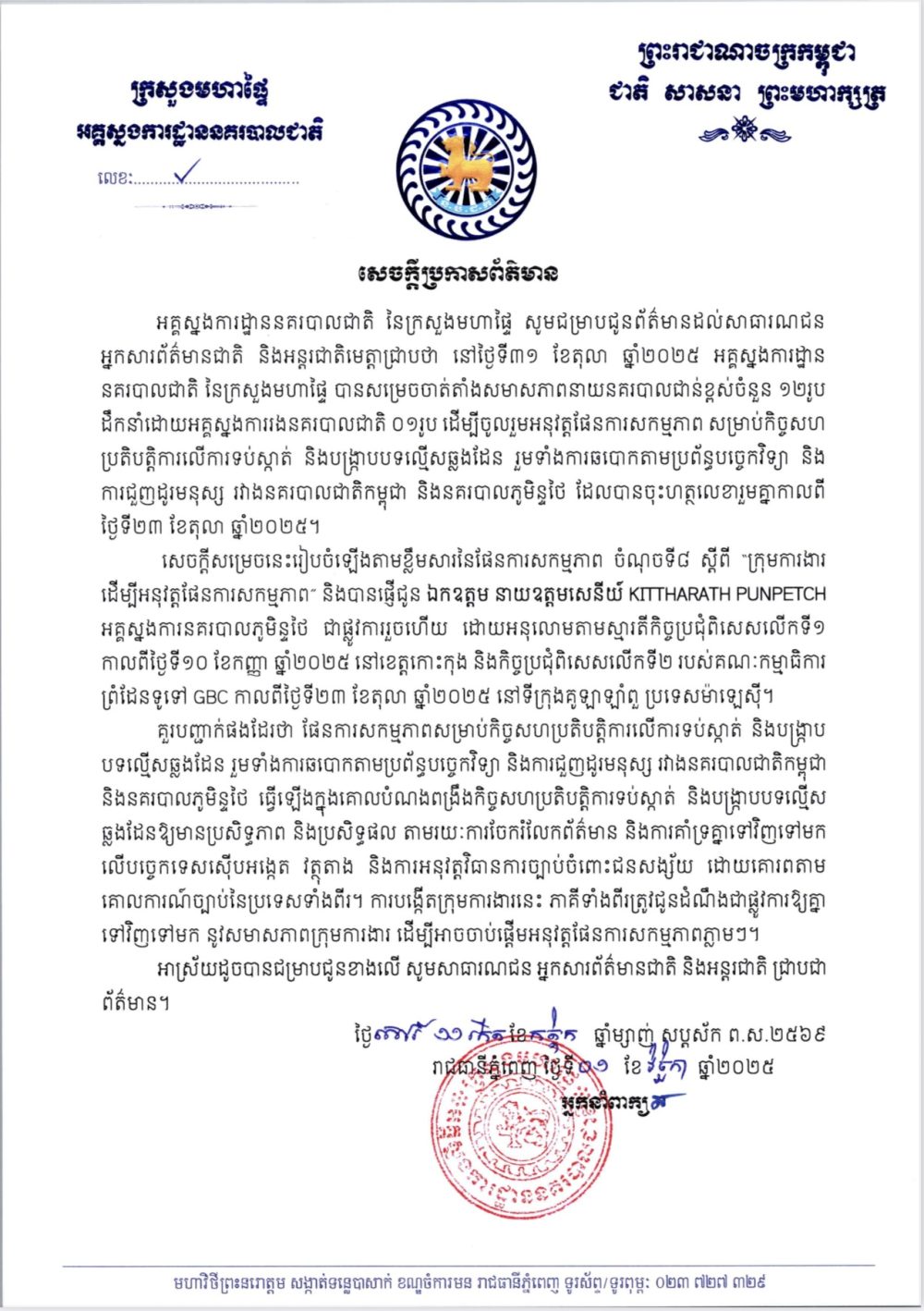 អគ្គស្នងការដ្ឋាននគរបាលជាតិ បានចេញសេចក្តីប្រកាសព័ត៌មានដល់សាធារណជន អ្នកសារព័ត៌មានជាតិ និងអន្តរជាតិជ្រាបថា កាលពីថ្ងៃទី៣១ ខែតុលា ឆ្នាំ២០២៥ អគ្គស្នងការដ្ឋាននគរបាលជាតិ នៃក្រសួងមហាផ្ទៃ បានសម្រេចចាត់តាំងសមាសភាពនាយនគរបាលជាន់ខ្ពស់ចំនួន ១២រូប ដឹកនាំដោយអគ្គស្នងការរងនគរបាលជាតិ ០១រូប ដើម្បីចូលរួមអនុវត្តផែនការសកម្មភាព សម្រាប់កិច្ចសហប្រតិបត្តិការលើការទប់ស្កាត់ និងបង្ក្រាបបទល្មើសឆ្លងដែន រួមទាំងការឆបោកតាមប្រព័ន្ធបច្ចេកវិទ្យា និងការជួញដូរមនុស្ស រវាងនគរបាលជាតិកម្ពុជា និងនគរបាលភូមិន្ទថៃ ដែលបានចុះហត្ថលេខារួមគ្នាកាលពីថ្ងៃទី២៣ ខែតុលា ឆ្នាំ២០២៥។