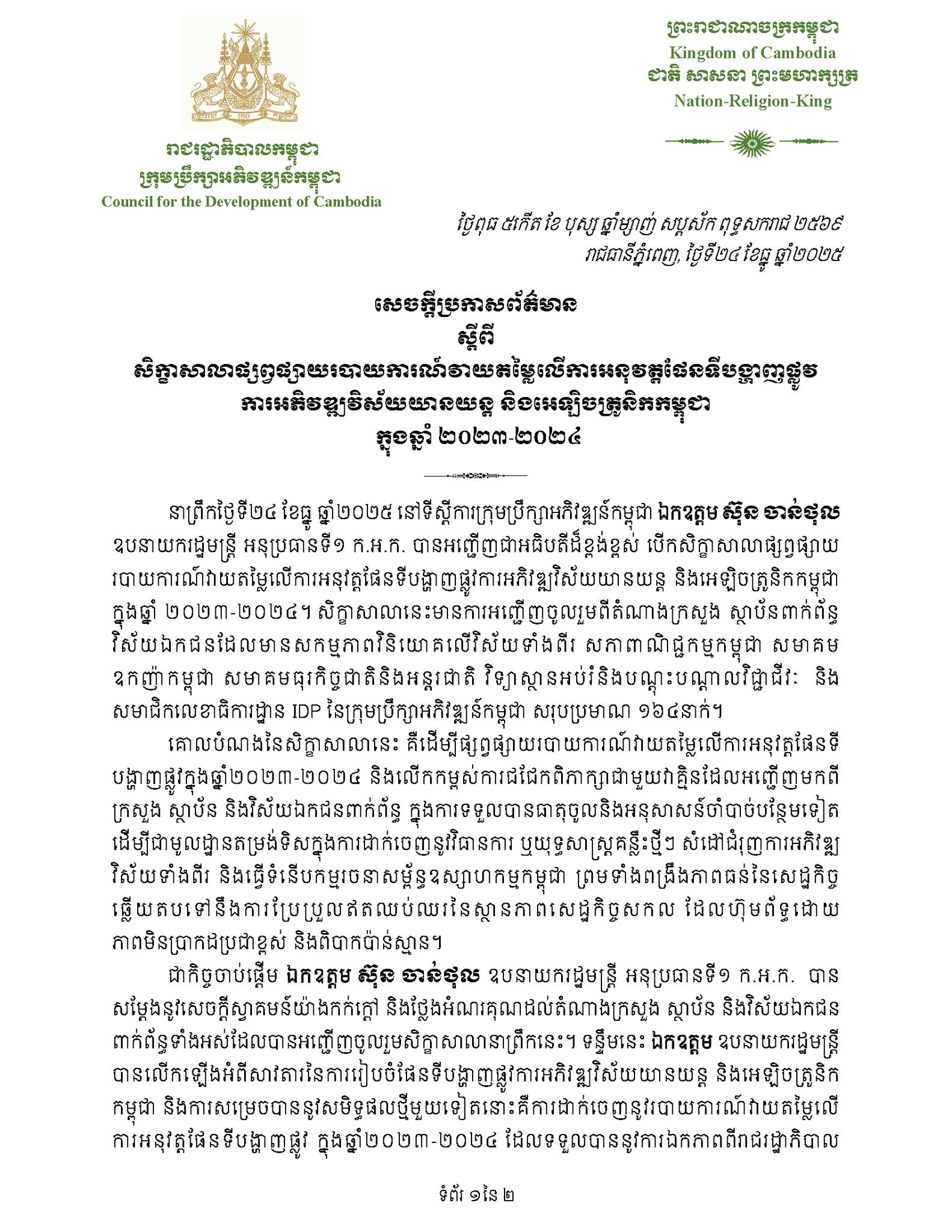 នៅថ្ងៃទី២៤ ខែធ្នូ ឆ្នាំ២០២៥ ក្រុមប្រឹក្សាអភិវឌ្ឍន៍កម្ពុជា បានចេញសេចក្ដីប្រកាសព័ត៌មាន ស្ដីពី សិក្ខាសាលាផ្សព្វផ្សាយរបាយការណ៍វាយតម្លៃលើការអនុវត្តផែនទីបង្ហាញផ្លូវការអភិវឌ្ឍវិស័យយានយន្ត និងអេឡិចត្រូនិកកម្ពុជា ក្នុងឆ្នាំ ២០២៣-២០២៤។