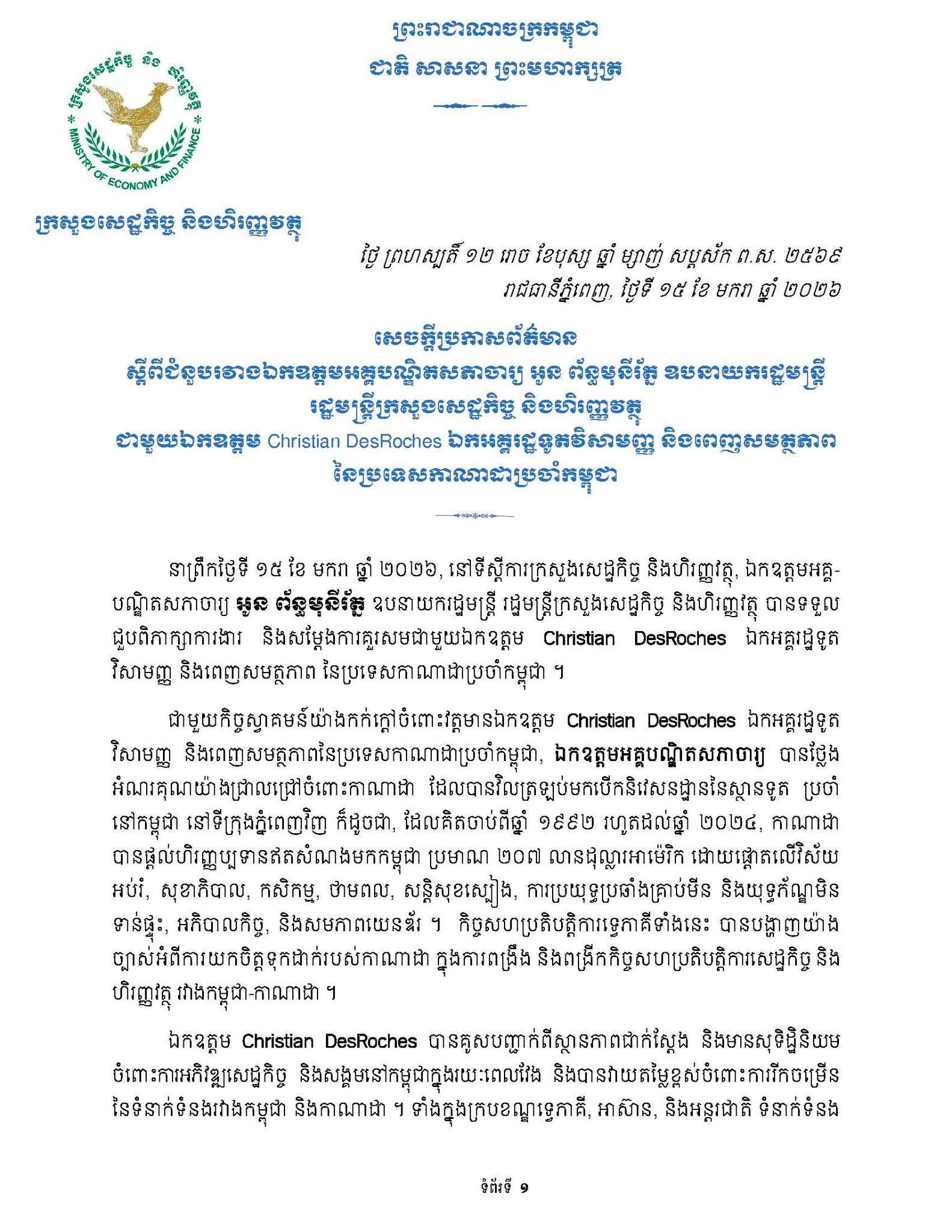 នៅថ្ងៃទី១៥ ខែមករា ឆ្នាំ២០២៦ ក្រសួងសេដ្ឋកិច្ច និងហិរញ្ញវត្ថុ បានចេញសេចក្ដីប្រកាសព័ត៌មាន ស្ដីពី ជំនួបរវាង ឯកឧត្តមអគ្គបណ្ឌិតសភាចារ្យ អូន ព័ន្ធមុនីរ័ត្ន ឧបនាយករដ្ឋមន្រ្តី រដ្ឋមន្រ្តីក្រសួងសេដ្ឋកិច្ច និងហិរញ្ញវត្ថុ ជាមួយឯកឧត្តម Christian DesRoches ឯកអគ្គរដ្ឋទូតវិសាមញ្ញ និងពេញសមត្ថភាពនៃប្រទេសកាណាដាប្រចាំកម្ពុជា។
