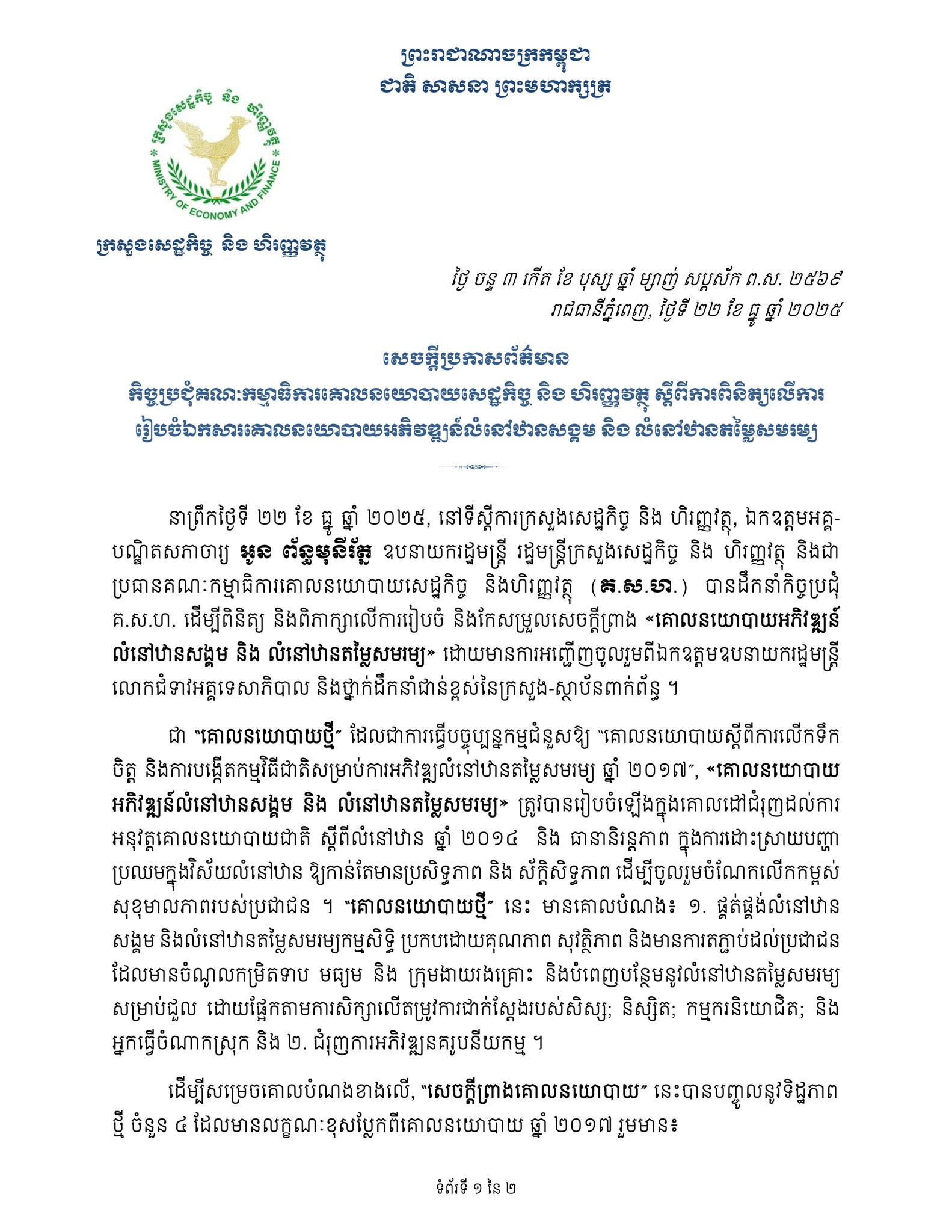 នៅថ្ងៃទី២២ ខែធ្នូ ឆ្នាំ២០២៥ ក្រសួងសេដ្ឋកិច្ច និងហិរញ្ញវត្ថុ បានចេញសេចក្ដីប្រកាសព័ត៌មាន ស្ដីពី កិច្ចប្រជុំគណៈកម្មាធិការគោលនយោបាយសេដ្ឋកិច្ច និងហិរញ្ញវត្ថុ ស្ដីពីការពិនិត្យលើការរៀបចំគោលនយោបាយអភិវឌ្ឍន៍លំនៅឋានសង្គម និងលំនៅឋានតម្លៃសមរម្យ។
