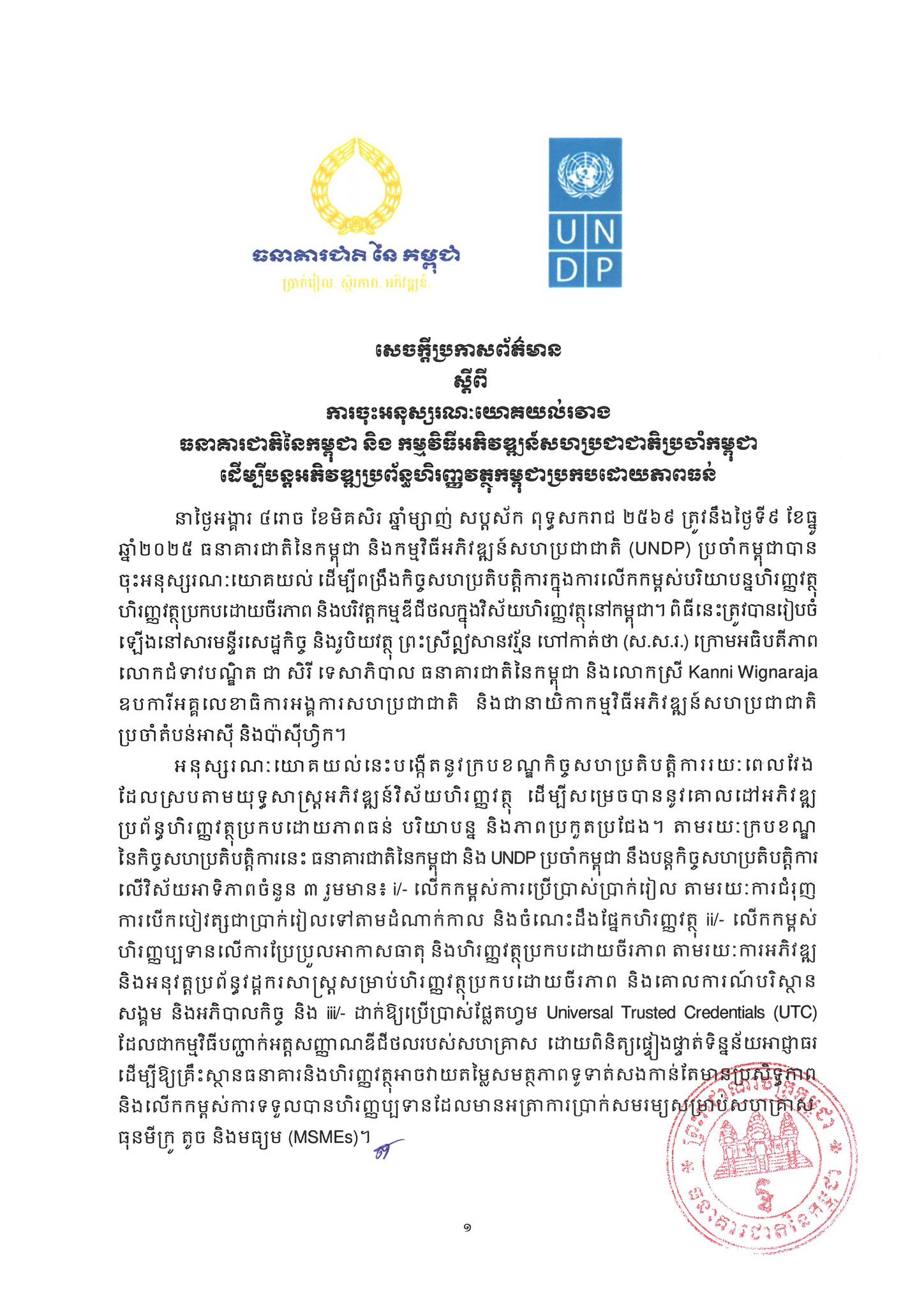 ​នៅ​ថ្ងៃ​ទី​៩​ ខែធ្នូ​ ឆ្នាំ​២០២៥​ ធនាគារជាតិ​នៃ​កម្ពុជា​ (NBC)​ និង​កម្មវិធី​អភិវឌ្ឍន៍​សហប្រជាជាតិ​ (UNDP)​ បាន​ចេញ​សេចក្តីថ្លែងការណ៍​ស្តី​ពី​ការ​ចុះ​អនុស្សរណៈ​យោគយល់​ (MoU)​ ដើម្បី​ពង្រឹង​កិច្ច​សហប្រតិបត្តិការ​លើ​បរិ​យា​បន្ន​ហិរញ្ញវត្ថុ​ ហិរញ្ញវត្ថុ​ប្រកបដោយ​ចីរភាព​ និង​បរិវត្ត​កម្ម​ឌី​ជី​ថ​ល​ក្នុង​វិស័យ​ហិរញ្ញវត្ថុ​នៅ​កម្ពុជា​។​ កិច្ច​សហប្រតិបត្តិការ​នេះ​ផ្តោត​លើ​វិស័យ​អាទិភាព​ចំនួន​ ៣​ រួម​មាន​ ការ​លើកកម្ពស់​ការ​ប្រើប្រាស់​ប្រាក់​រៀល​ ការ​ជំរុញ​ហិរញ្ញវត្ថុ​អាកាសធាតុ​ និង​ចីរភាព​ និង​ការ​ដាក់​ឱ្យ​ដំណើរការ​ប្រព័ន្ធ​ទូទាត់​ឌី​ជី​ថ​ល​ ដើម្បី​រួមចំណែក​ដល់​ការ​អភិវឌ្ឍ​សេដ្ឋកិច្ច​ប្រកបដោយ​បរិ​យា​បន្ន​ និង​ចីរភាព​ ស្រប​តាម​យុទ្ធសាស្ត្រ​បញ្ច​កោណ​របស់​រាជរដ្ឋាភិបាល​។​ ភាព​ជា​ដៃគូ​នេះ​ក៏​មាន​គោលបំណង​គាំទ្រ​ដល់​ដំណើរ​របស់​កម្ពុជា​ក្នុង​ការ​ចាក​ចេញពី​ក្រុម​ប្រទេស​អភិវឌ្ឍន៍​តិចតួច​នៅ​ឆ្នាំ​២០២៩​ ផង​ដែរ​។​