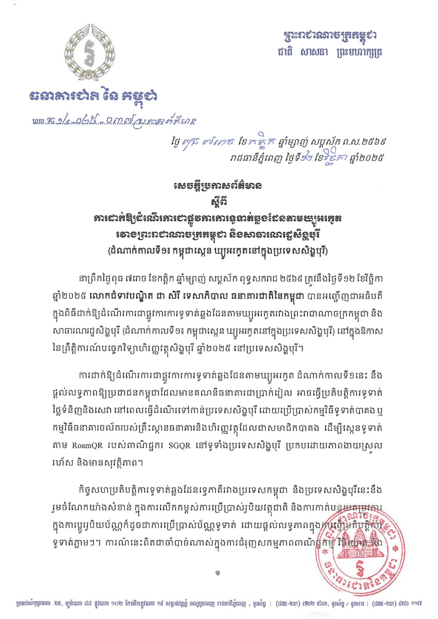 សេចក្តីប្រកាសព័ត៌មាន៖ ការដាក់ឱ្យដំណើរការជាផ្លូវការការទូទាត់ឆ្លងដែនតាមឃ្យូអរកូតរវាងព្រះរាជាណាចក្រកម្ពុជា និងសាធារណរដ្ឋសិង្ហបុរី
