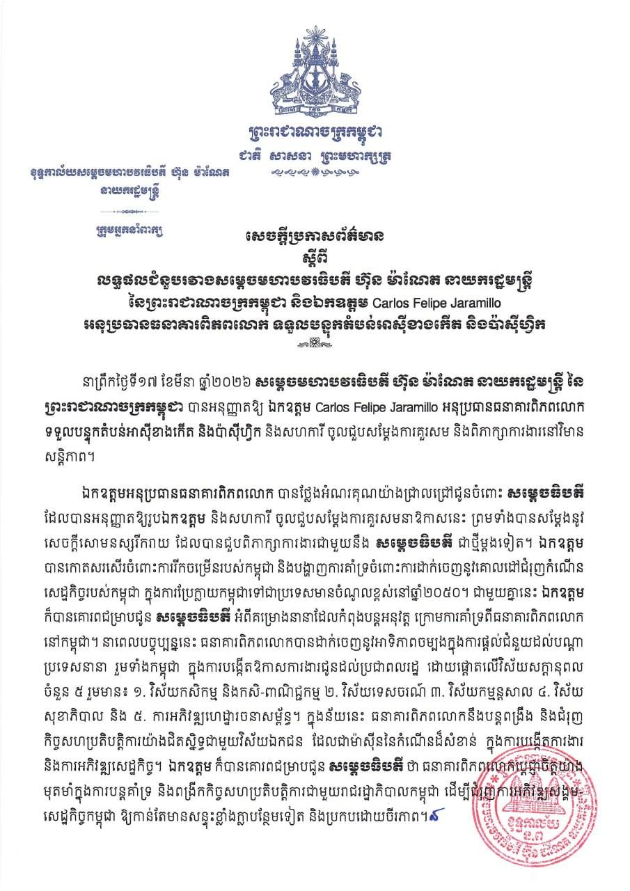 នៅថ្ងៃទី១៨ ខែមីនា ឆ្នាំ២០២៦ រាជរដ្ឋាភិបាលកម្ពុជា បានចេញសេចក្តីប្រកាសព័ត៌មានស្តីពីលទ្ធផលជំនួបរវាងសម្តេចមហាបវរធិបតី ហ៊ុន ម៉ាណែត នាយករដ្ឋមន្តី នៃព្រះរាជាណាចក្រកម្ពុជា និងឯកឧត្តម Carlos Felipe Jaramillo អនុប្រធានធនាគារពិភពលោក ទទួលបន្ទុកតំបន់អាស៊ីខាងកើត និងប៉ាស៊ីហ្វិក។