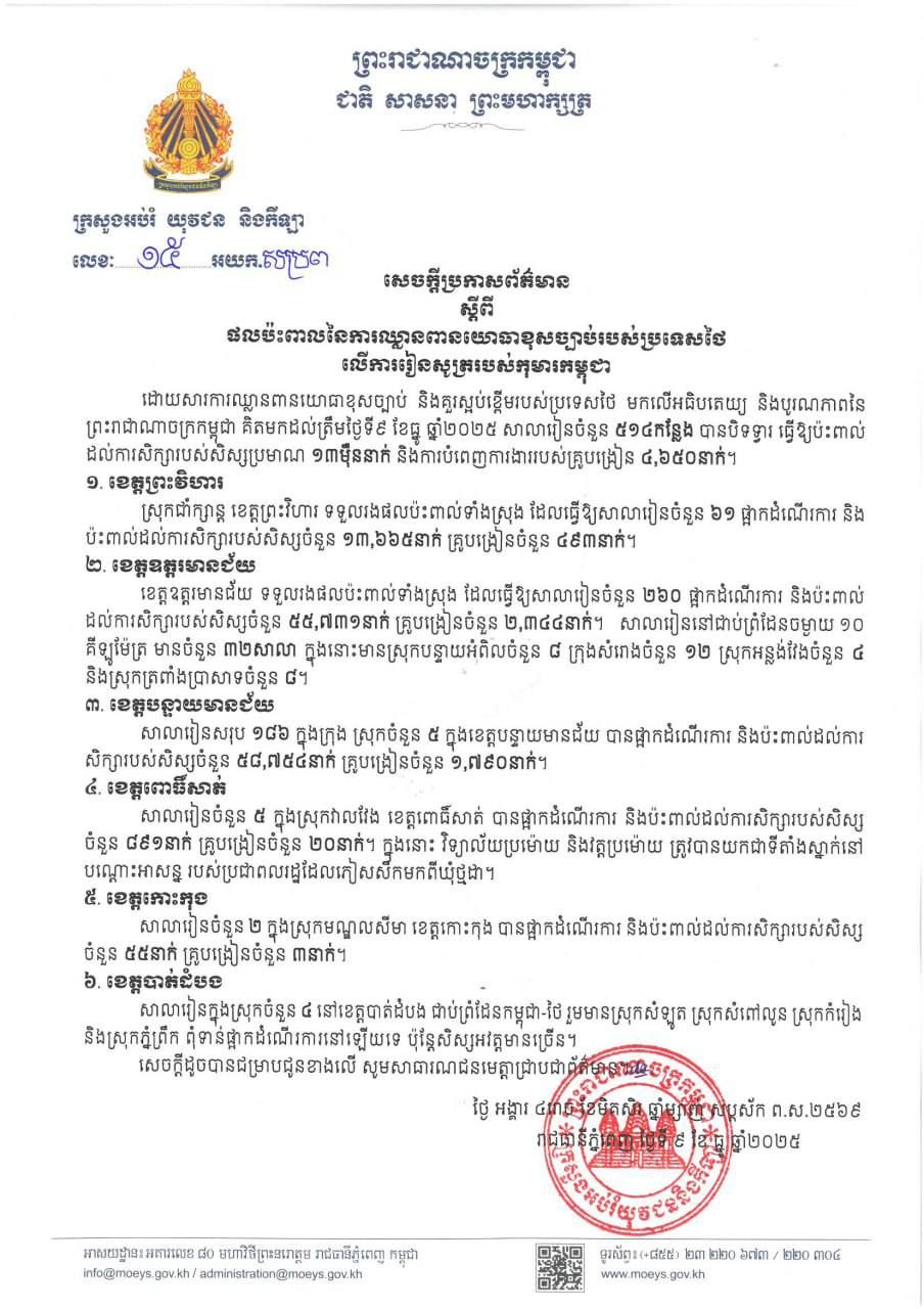 នៅថ្ងៃទី៩ ខែធ្នូ ឆ្នាំ២០២៥ ក្រសួងអប់រំ យុវជន និងកីឡា បានចេញសេចក្តីប្រកាសព័ត៌មានថា ដោយសារការឈ្លានពានយោធាខុសច្បាប់របស់ប្រទេសថៃ សាលារៀនសរុប ៥១៤ កន្លែង បានបិទទ្វារ គិតត្រឹមថ្ងៃទី៩ ខែធ្នូ ឆ្នាំ២០២៥ ដែលធ្វើឲ្យប៉ះពាល់ដល់ការសិក្សារបស់ សិស្សប្រមាណ ១៣ ម៉ឺននាក់ និងការងាររបស់គ្រូបង្រៀន ៤.៦៥០ នាក់។ ការប៉ះពាល់ខ្លាំងបំផុតកើតឡើងនៅខេត្តចំនួន ៤ គឺ ខេត្តព្រះវិហារ (៦១ សាលា) ខេត្តឧត្តរមានជ័យ (២៦០ សាលា) ខេត្តបន្ទាយមានជ័យ (១៨៦ សាលា) និង ខេត្តពោធិ៍សាត់ (៥ សាលា)។ ក្នុងចំណោមនោះ សាលារៀនចំនួន ៣២ នៅក្នុងខេត្តឧត្តរមានជ័យ ស្ថិតនៅចម្ងាយ ១០ គីឡូម៉ែត្រពីព្រំដែន។