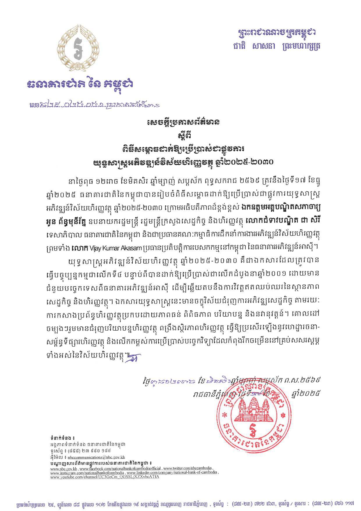 សេចក្តីប្រកាសព័ត៌មាន ស្តីពីពិធីសម្ពោធដាក់ឱ្យប្រើប្រាស់ជាផ្លូវការ យុទ្ធសាស្ត្រអភិវឌ្ឍន៍វិស័យហិរញ្ញវត្ថុ ឆ្នាំ២០២៥-២០៣០