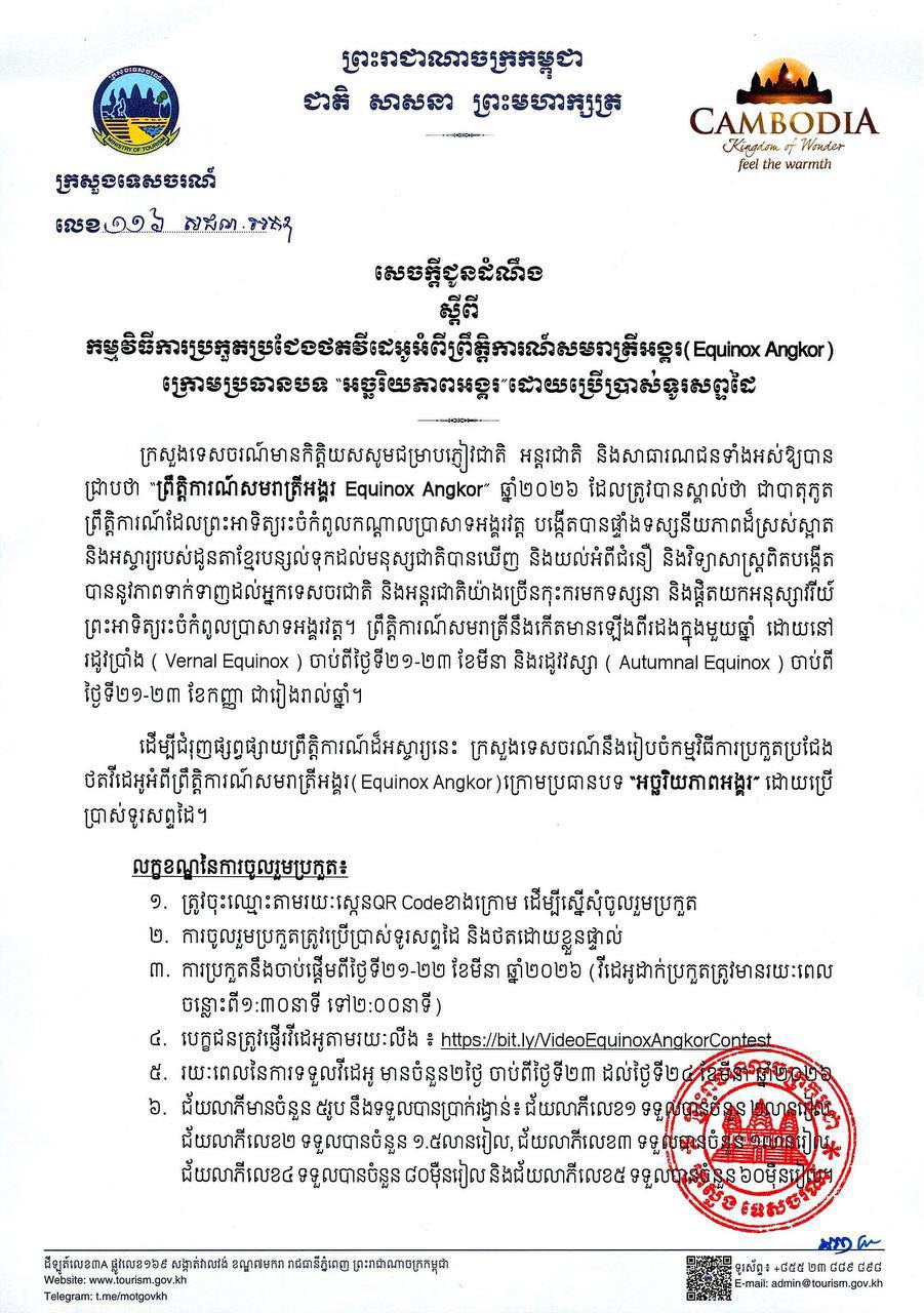 នៅថ្ងៃទី១៩ ខែមីនា ឆ្នាំ២០២៦ ក្រសួងទេសចរណ៍ នៃរាជរដ្ឋាភិបាលកម្ពុជា បានចេញសេចក្តីប្រកាសព័ត៌មានស្តីពីការរៀបចំព្រឹត្តិការណ៍អង្គរអេក្វីណុក និងការប្រកួតវីដេអូ “អង្គរអេក្វីណុក”។