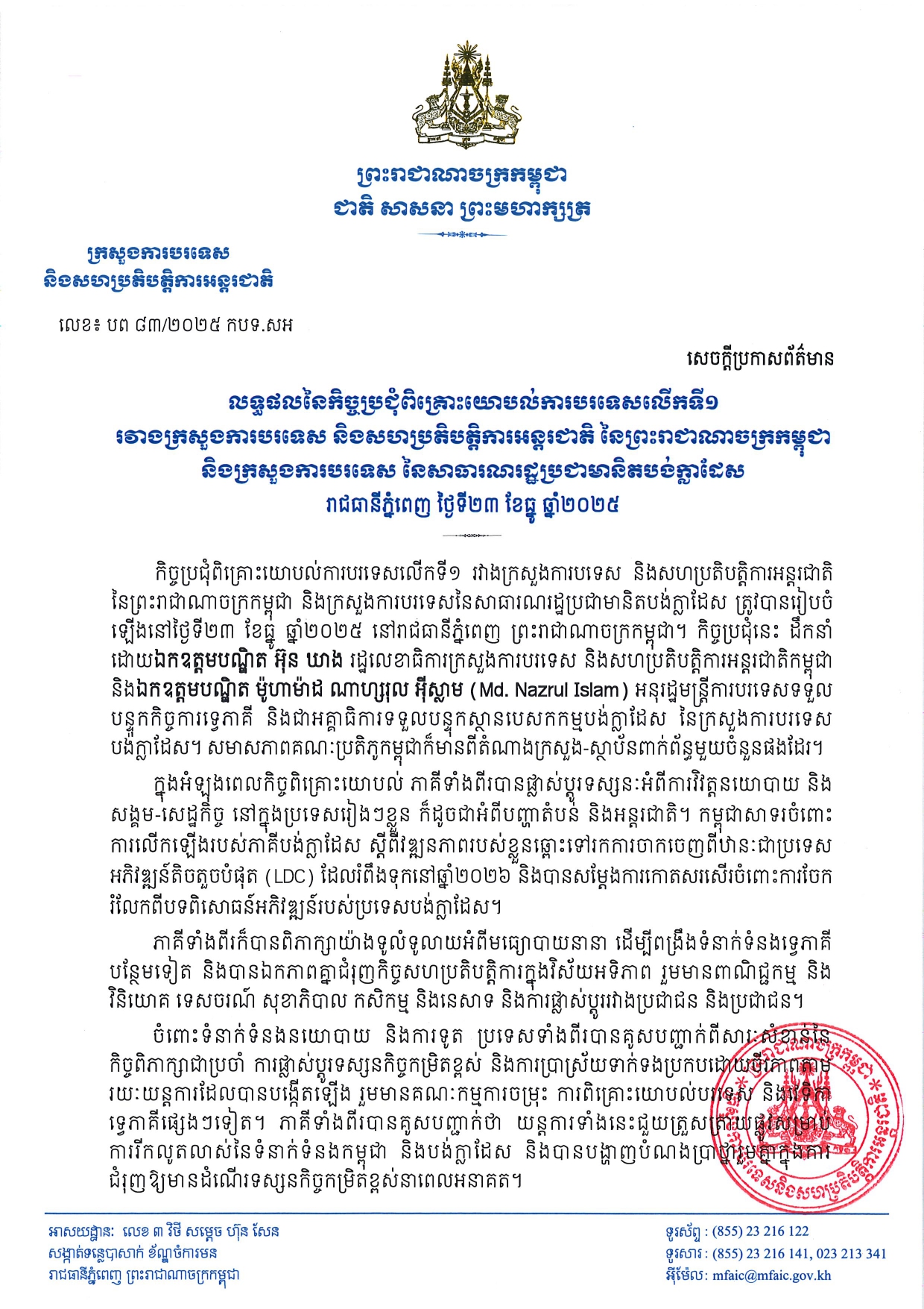 នៅថ្ងៃទី២៦ ខែធ្នូ ឆ្នាំ២០២៥ ក្រសួងការបរទេស និងសហប្រតិបត្តិការអន្តរជាតិ បានចេញសេចក្ដីប្រកាសព័ត៌មាន ស្ដីពី លទ្ធផលនៃកិច្ចប្រជុំពិគ្រោះយោបល់ការបរទេសលើកទី១ រវាងក្រសួងការបរទេស និងសហប្រតិបត្តិការអន្តរជាតិ នៃព្រះរាជាណាចក្រកម្ពុជា និងក្រសួងការបរទេស នៃសាធារណរដ្ឋប្រជាមានិតបង់ក្លាដែស។