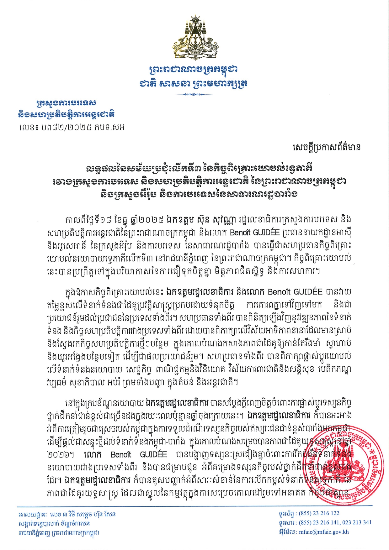 នៅថ្ងៃទី២៦ ខែធ្នូ ឆ្នាំ២០២៥ ក្រសួងការបរទេស និងសហប្រតិបត្តិការអន្តរជាតិ បានចេញសេចក្ដីប្រកាសព័ត៌មាន ស្ដីពី លទ្ធផលនៃសម័យប្រជុំលើកទី៣ នៃកិច្ចពិគ្រោះយោបល់ទ្វេភាគីរវាងក្រសួងការបរទេស និងសហប្រតិបត្តិការអន្តរជាតិ នៃព្រះរាជាណាចក្រកម្ពុជា និងក្រសួងអឺរ៉ុប និងការបរទេសនៃសាធារណរដ្ឋបារាំង។
