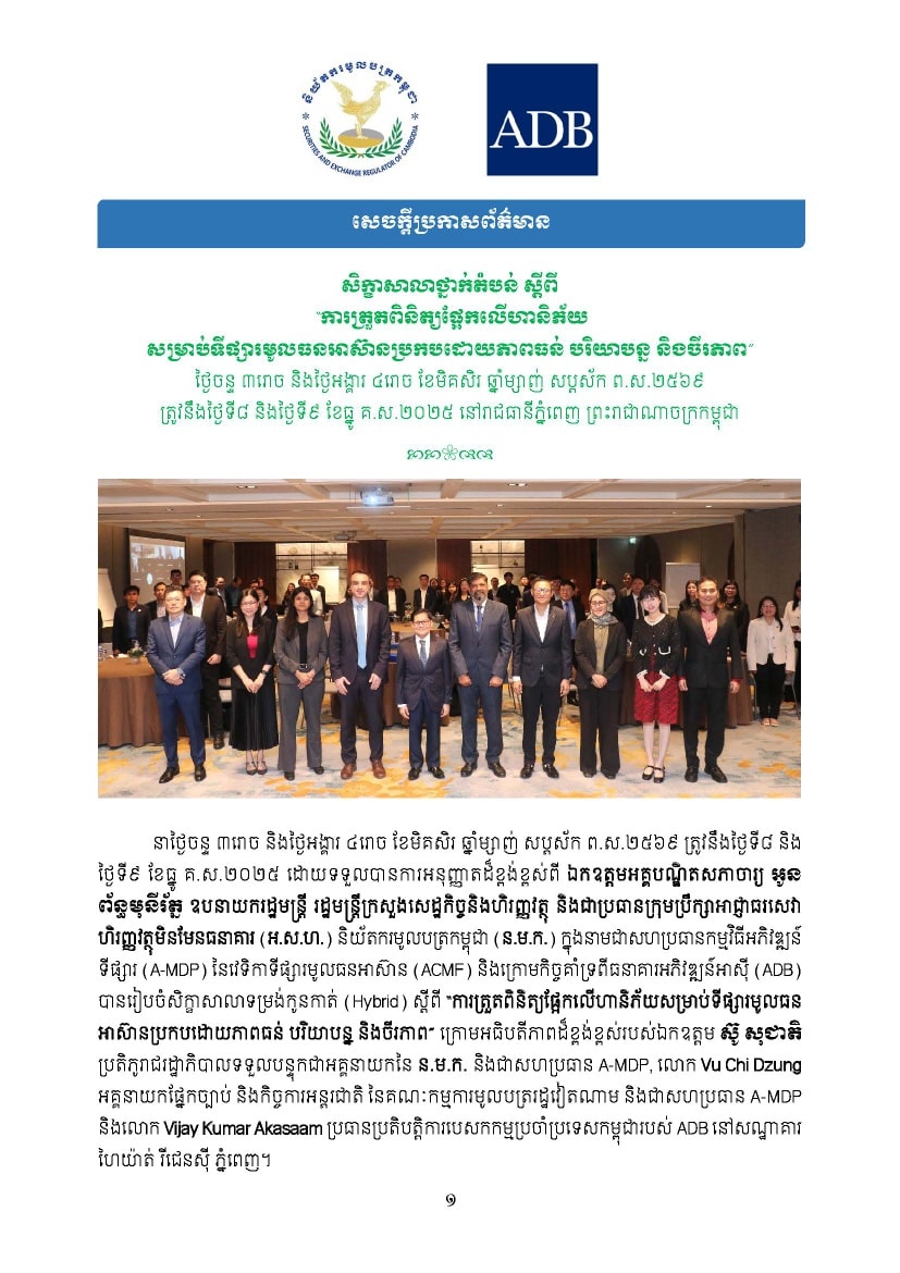 នៅថ្ងៃទី៨ និងថ្ងៃទី៩ ខែធ្នូ ឆ្នាំ២០២៥ និយ័តករមូលបត្រកម្ពុជា បានចេញសេចក្តីប្រកាសព័ត៌មាន ស្ដីពី សិក្ខាសាលាថ្នាក់តំបន់ ស្តីពី «ការត្រួតពិនិត្យផ្អែកលើហានិភ័យសម្រាប់ទីផ្សារមូលធនអាស៊ានប្រកបដោយភាពធន់ បរិយាបន្ន និងចីរភាព»។