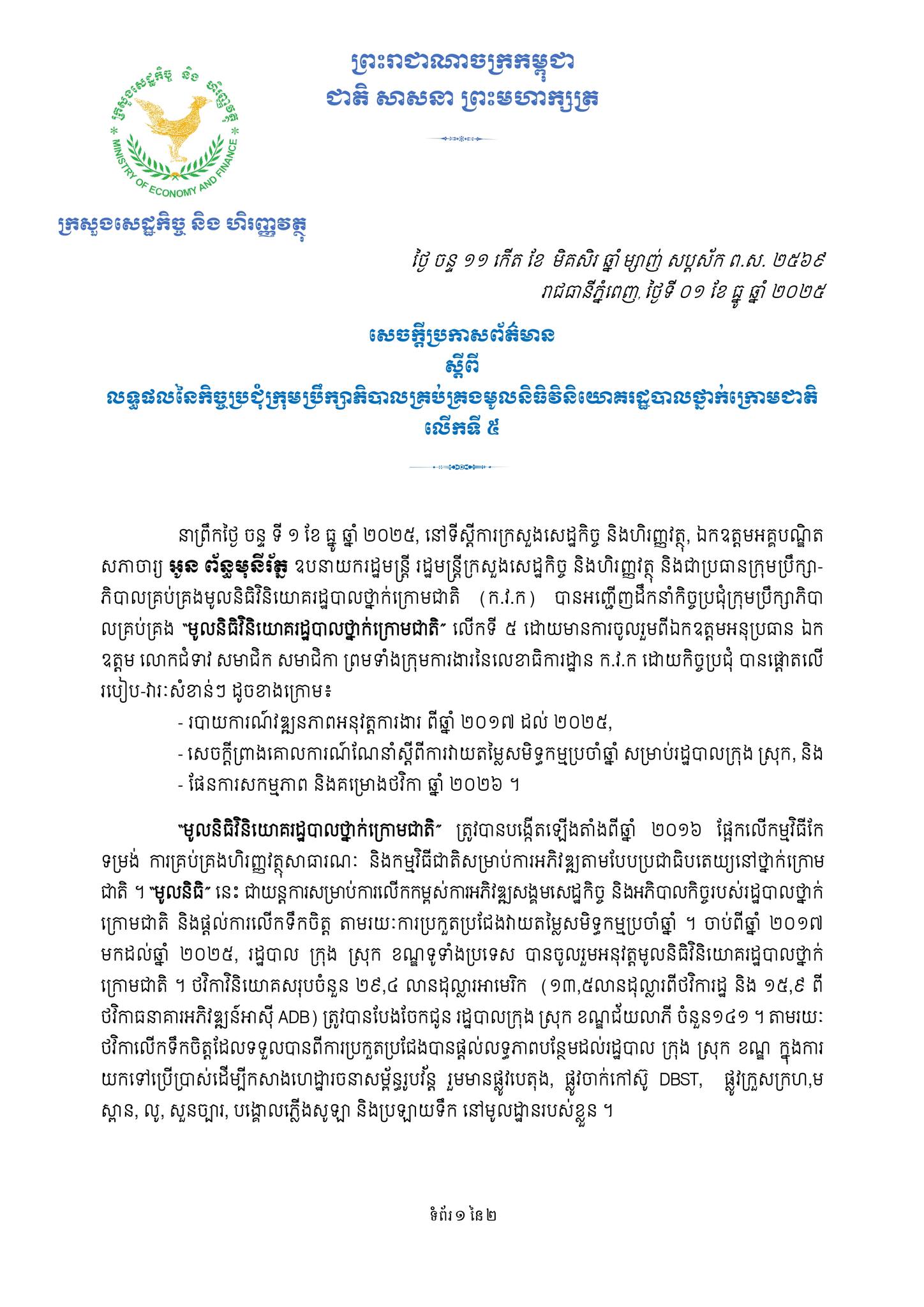 នៅថ្ងៃទី១ ខែ ធ្នូ ឆ្នាំ ២០២៥  ក្រសួងសេដ្ឋកិច្ច និងហិរញ្ញវត្ថុបានចេញសេចក្ដីប្រកាសអំពី លទ្ធផលនៃកិច្ចប្រជុំក្រុមប្រឹក្សាភិបាលគ្រប់គ្រងមូលនិធិវិនិយោគរដ្ឋបាលថ្នាក់ក្រោមជាតិ លើកទី ៥។ ជាលទ្ធផល, អង្គប្រជុំ បានពិនិត្យ និងអនុម័តលើ “សេចក្តីព្រាងគោលការណ៍ណែនាំស្តីពីការវាយតម្ល សមិទ្ធកម្មប្រចាំឆ្នាំសម្រាប់រដ្ឋបាល ក្រុង ស្រុក(ថ្មី) ដែលនឹងត្រូវដាក់ឱ្យអនុវត្តចាប់ពីឆ្នាំ២០២៦តទៅ ដែលគោលការណ៍ណែនាំថ្មីនេះនឹងត្រូវបានប្រើប្រាស់ជាឧបករណ៍វាយតម្លៃ (សមិទ្ធកម្មការងារ) ការអនុវត្តការងារនៅរដ្ឋបាលក្រុង ស្រុក ដើម្បីចូលរួមពង្រឹងសមត្ថភាពអភិបាលកិច្ច និងលើកកម្ពស់គុណភាពស្ថាប័ន ដែលជាគោលដៅយុទ្ធសាស្ត្រមួយដែលមានចែងក្នុងយុទ្ធសាស្ត្របញ្ចកោណដំណាក់កាលទី១របស់រាជរដ្ឋាភិបាលកម្ពុជា ។