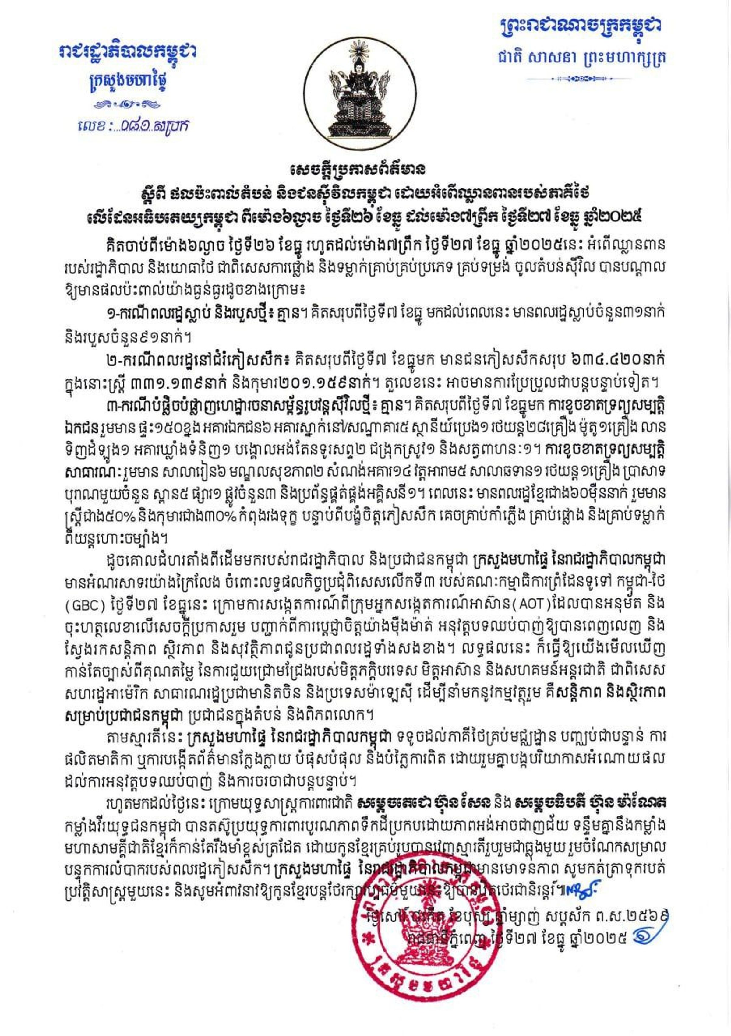 នៅថ្ងៃទី២៧ ខែធ្នូ ឆ្នាំ២០២៥ ក្រសួងមហាផ្ទៃ បានចេញសេចក្ដីប្រកាសព័ត៌មាន ស្ដីពី ផលប៉ះពាល់តំបន់ និងជនស៊ីវិលកម្ពុជា ដោយអំពើឈ្លានពានរបស់ភាគីថៃ លើដែនអធិបតេយ្យកម្ពុជា ពីម៉ោង៦ល្ងាច ថ្ងៃទី២៦ ខែធ្នូ ដល់ម៉ោង៧ព្រឹក ថ្ងៃទី២៧ ខែធ្នូ ឆ្នាំ២០២៥។