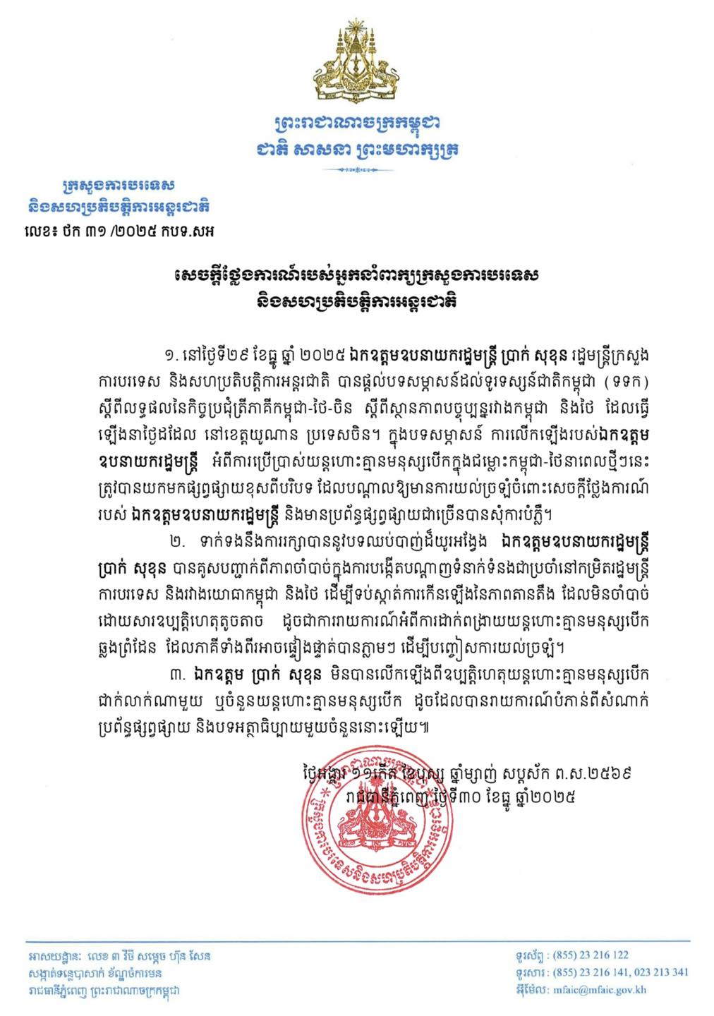 នៅថ្ងៃទី៣០ ខែធ្នូ ឆ្នាំ២០២៥ ក្រសួងការបរទេស និងសហប្រតិបត្តិការអន្តរជាតិ បានចេញសេចក្តីថ្លែងការណ៍របស់អ្នកនាំពាក្យក្រសួងការបរទេស និងសហប្រតិបត្តិការអន្តរជាតិ ស្ដីពី ការប្រើប្រាស់យន្តហោះគ្មានមនុស្សបើកក្នុងជម្លោះកម្ពុជា-ថៃនាពេលថ្មីៗ។