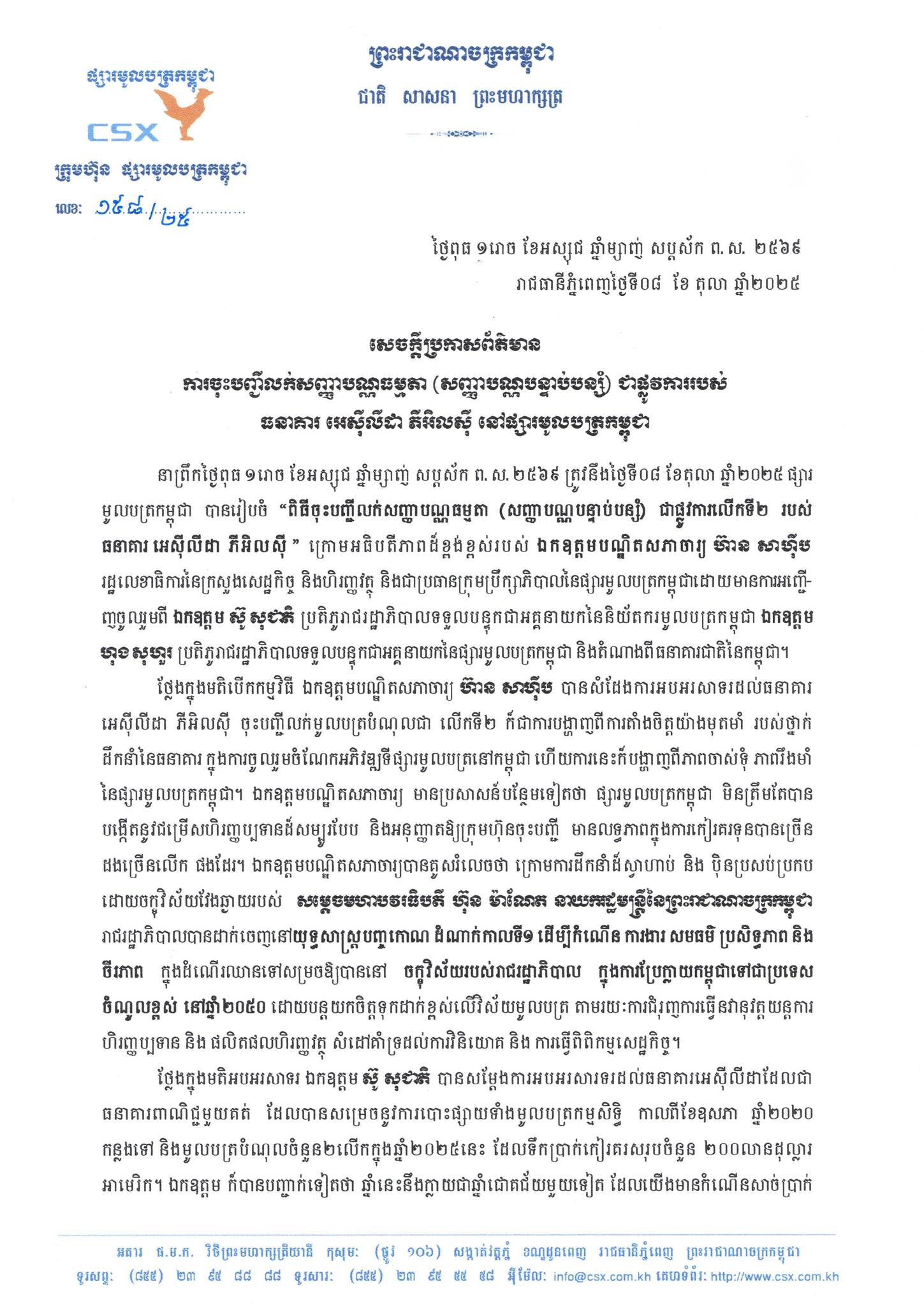 សេចក្ដីប្រកាសពត៌មាន៖ ពិធីចុះបញ្ជីលក់សញ្ញាបណ្ណធម្មតា (សញ្ញាបណ្ណបន្ទាប់បន្សំ) ជាផ្លូវការរបស់ ធនាគារ អេស៊ីលីដា ភីអិលស៊ី