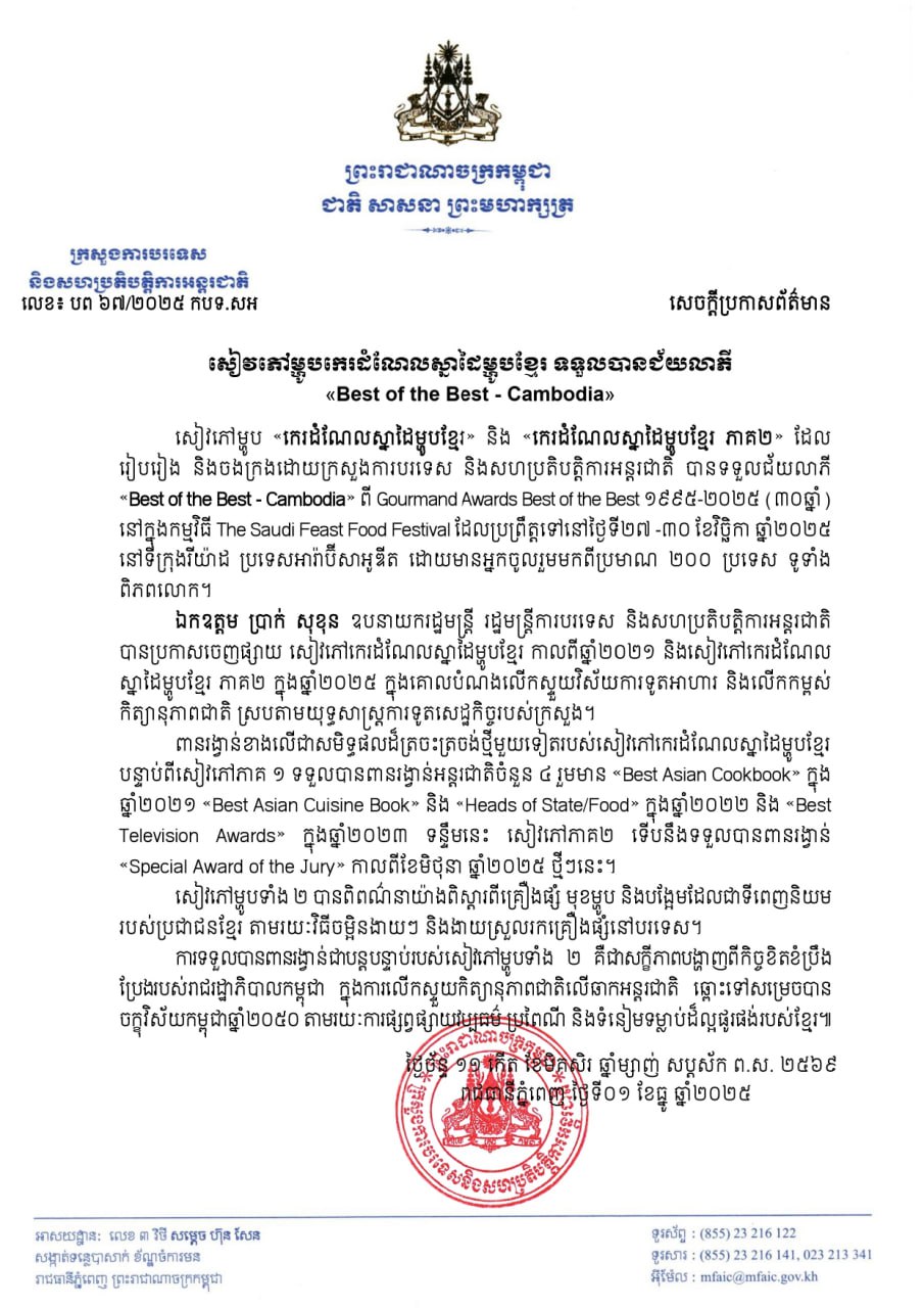 សៀវភៅម្ហូប “កេរដំណែលស្នាដៃម្ហូបខ្មែរ“ និង “កេរដំណែលស្នាដៃម្ហូបខ្មែរ ភាគ២“ ដែលរៀបរៀង និងចងក្រងដោយក្រសួងការបរទេស និងសហប្រតិបត្តិការអន្តរជាតិ បានទទួលជ័យលាភី “Best of the Best - Cambodia” ពី Gourmand Awards Best of the Best ១៩៩៥-២០២៥ ...