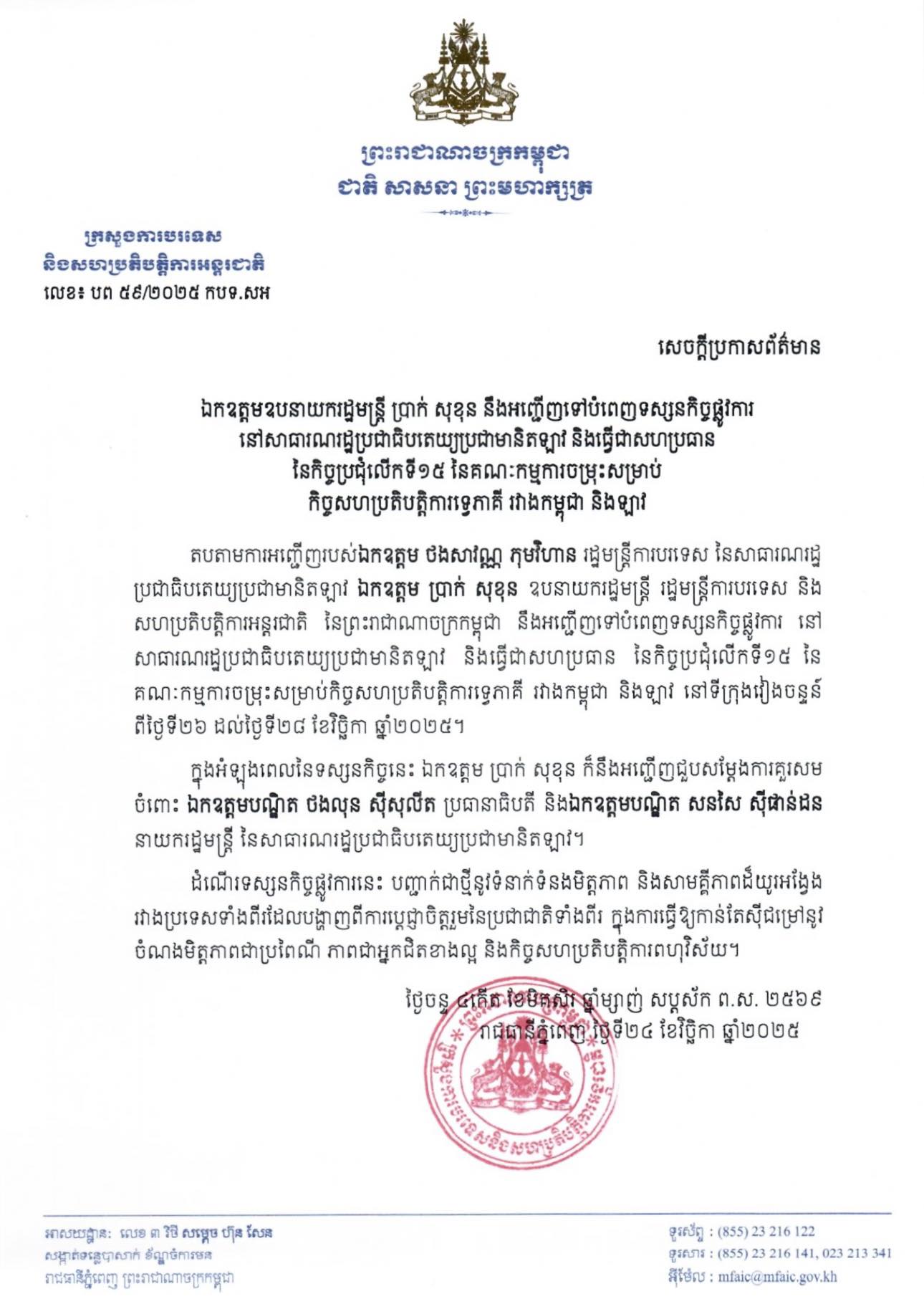 នៅថ្ងៃទី២៤ ខែវិច្ឆិកា ឆ្នាំ២០២៥ ក្រសួងការបរទេស និងសហប្រតិបត្តិការអន្តរជាតិ បានចេញសេចក្តីប្រកាសព័ត៌មាន ស្តីពី ដំណើរទស្សនកិច្ចផ្លូវការរបស់ឧបនាយករដ្ឋមន្ត្រី ប្រាក់ សុខុន នៅប្រទេសឡាវ និងធ្វើជាសហប្រធានកិច្ចប្រជុំលើកទី១៥ នៃគណៈកម្មការចម្រុះសម្រាប់កិច្ចសហប្រតិបត្តិការទ្វេភាគី កម្ពុជា-ឡាវ។ដំណើរទស្សនកិច្ចផ្លូវការនេះ បញ្ជាក់ជាថ្មីនូវទំនាក់ទំនងមិត្តភាព និងសាមគ្គីភាពដ៏យូរអង្វែង រវាងប្រទេសទាំងពីរដែលបង្ហាញពីការប្តេជ្ញាចិត្តរួមនៃប្រជាជាតិទាំងពីរ ក្នុងការធ្វើឱ្យកាន់តែស៊ីជម្រៅនូវចំណងមិត្តភាពជាប្រពៃណី ភាពជាអ្នកជិតខាងល្អ និងកិច្ចសហប្រតិបត្តិការពហុវិស័យ។ ...