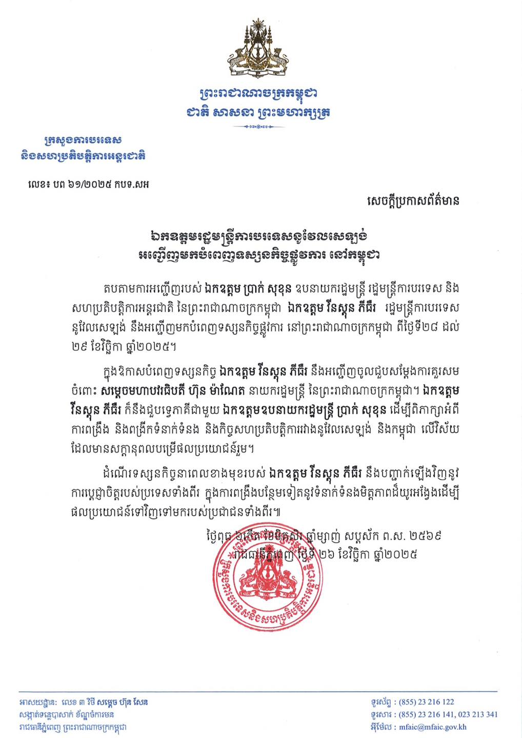 នៅថ្ងៃទី២៦ ខែវិច្ឆិកា ឆ្នាំ២០២៥ ក្រសួងការបរទេស និងសហប្រតិបត្តិការអន្តរជាតិ បានចេញសេចក្តីប្រកាសព័ត៌មាន ស្តីពី ដំណើរបំពេញទស្សនកិច្ចផ្លូវការរបស់រដ្ឋមន្ត្រីការបរទេសនូវែលសេឡង់ នៅកម្ពុជា។ ដំណើរទស្សនកិច្ចនាពេលខាងមុខរបស់ ឯកឧត្តម វ័នស្តុន ភីធឺរ នឹងបញ្ចាក់ឡើងវិញនូវ ការប្តេជ្ញាចិត្តរបស់ប្រទេសទាំងពីរ ក្នុងការពង្រឹងបន្ថែមទៀតនូវទំនាក់ទំនងមិត្តភាពដ៏យូរអង្វែងដើម្បី ផលប្រយោជន៍ទៅវិញទៅមករបស់ប្រជាជនទាំងពីរ។ ...
