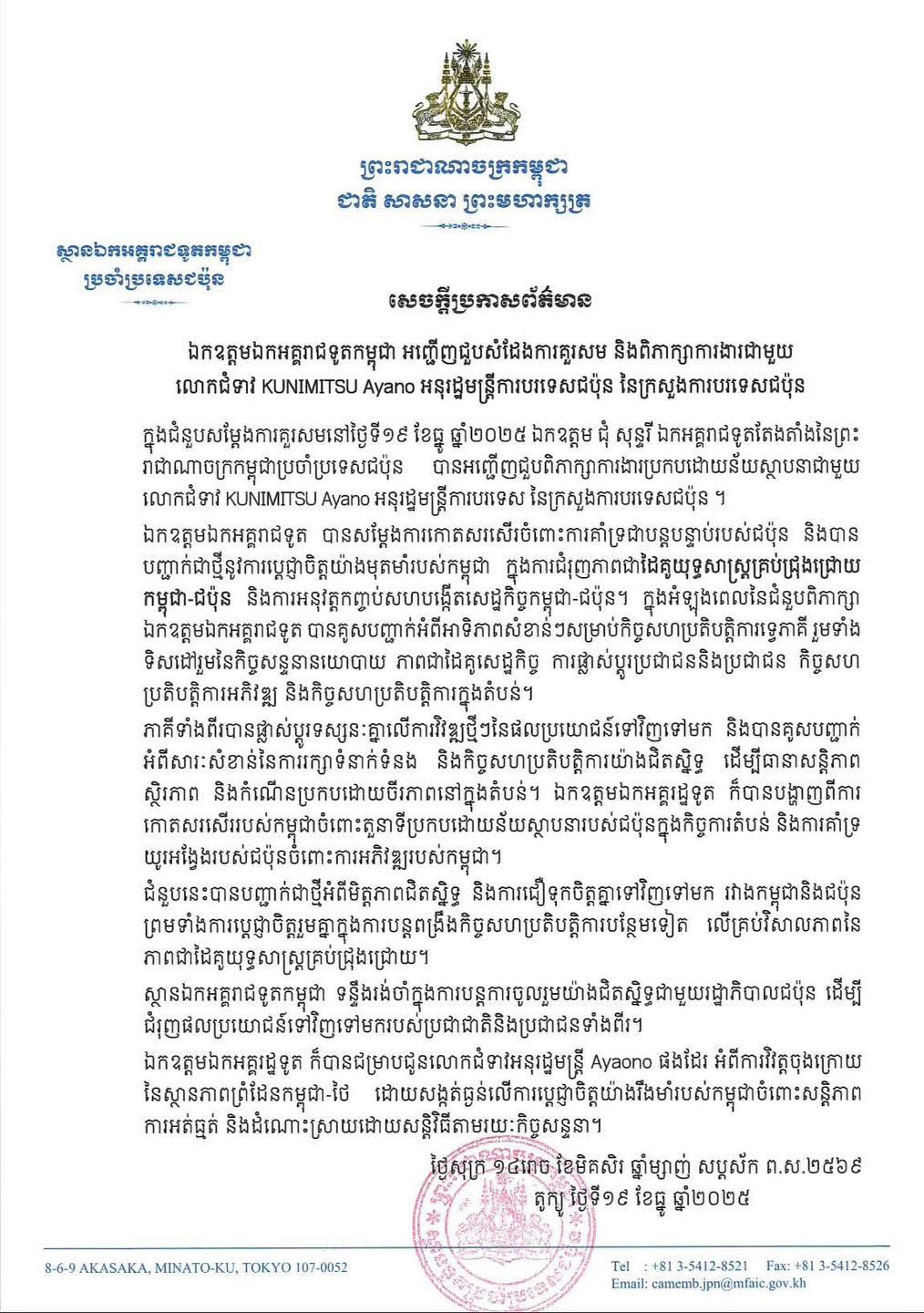 នៅថ្ងៃទី១៩ ខែធ្នូ ឆ្នាំ២០២៥ ស្ថានឯកអគ្គរាជទូតកម្ពុជាប្រចាំប្រទេសជប៉ុន បានចេញសេចក្តីប្រកាសព័ត៌មានស្តីពីជំនួបរវាងឯកឧត្តម ជុំ សុន្ទរី ឯកអគ្គរាជទូតតែងតាំងថ្មី និងលោកជំទាវ KUNIMITSU Ayano អនុរដ្ឋមន្ត្រីការបរទេសជប៉ុន ដើម្បីពិភាក្សាអំពីការជំរុញភាពជា ...