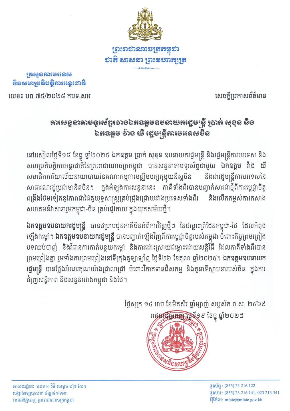 នៅថ្ងៃទី២០ ខែធ្នូ ឆ្នាំ២០២៥ ក្រសួងការបរទេស និងសហប្រតិបត្តិការអន្តរជាតិ បានចេញសេចក្ដីប្រកាសព័ត៌មាន ស្ដីពី ប្រេសិតពិសេសចិនមកភ្នំពេញ ដើម្បីពិភាក្សាអំពី ការបន្ធូរបន្ថយកំដៅជម្លោះកម្ពុជា-ថៃ។ក្នុងអំឡុងពេលនៃជំនួបទាំងនេះ ភាគីទាំងពីរបានគូសបញ្ជាក់អំពីភាពចាំបាច់តម្រូវឱ្យមានការឈប់បាញ់ជាងបន្ទាន់ដោយឥតបង្អែរបង្អង់ និងបានសង្កត់ធ្ងន់ថាការសន្ទនាដោយសន្តិវិធីនៅតែជាមាគ៌ តែមួយគត់ដែលអាចឈានទៅសម្រេចបាននូវការដោះស្រាយទំនាស់។ ...