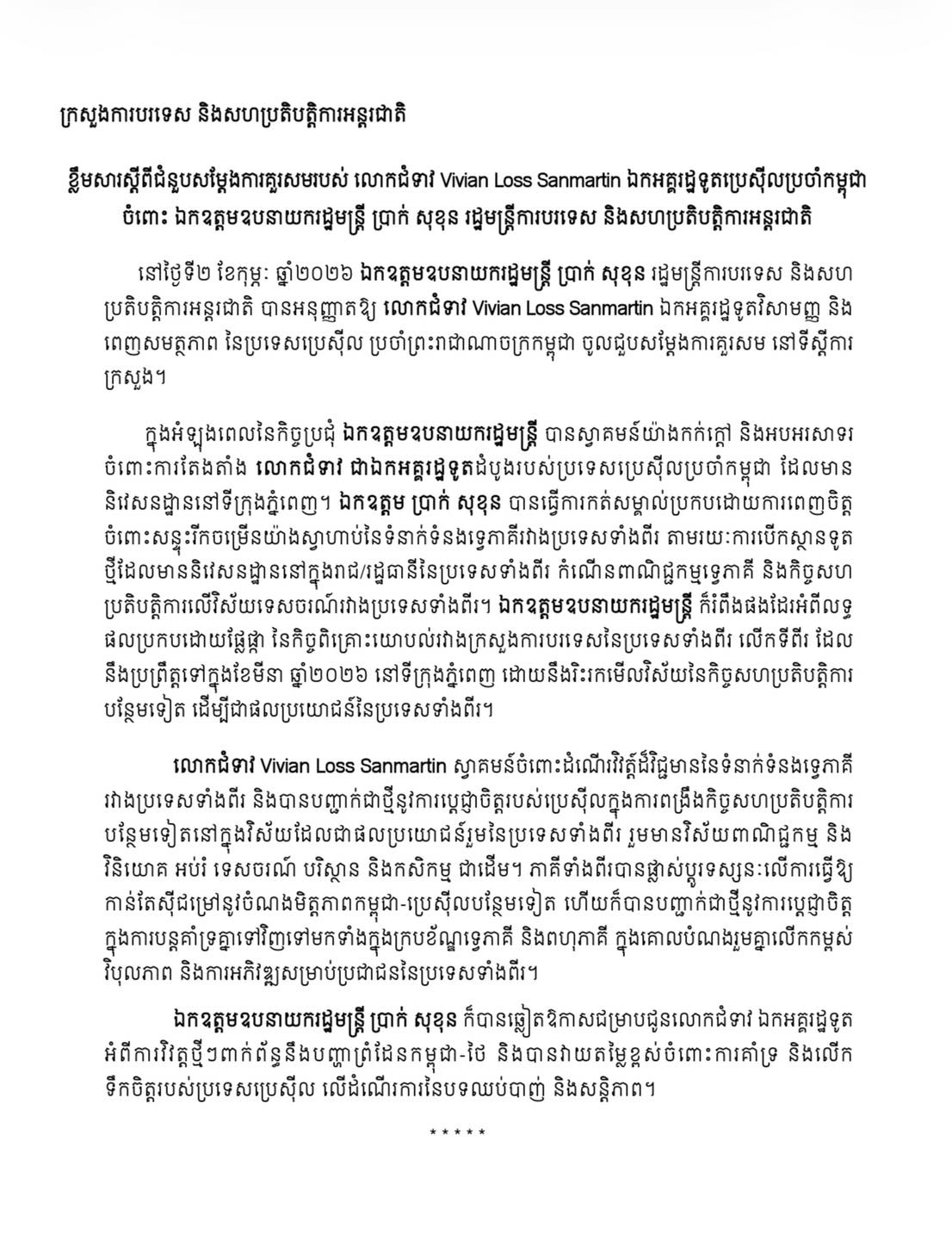 នៅថ្ងៃទី២ ខែកុម្ភៈ ឆ្នាំ២០២៦ ក្រសួងការបរទេស និងសហប្រតិបត្តិការអន្តរជាតិ បានចេញខ្លឹមសារ ស្តីពី ជំនួបសម្តែងការគួរសមរបស់ លោកជំទាវ Vivian Loss Sanmartin ឯកអគ្គរដ្ឋទូតប្រេស៊ីលប្រចាំកម្ពុជា ចំពោះ ឯកឧត្តមឧបនាយករដ្ឋមន្ត្រី ប្រាក់ សុខុន រដ្ឋមន្ត្រីការបរទេស និងសហប្រតិបត្តិការអន្តរជាតិ។ឯកឧត្តម ប្រាក់ សុខុន បានធ្វើការកត់សម្គាល់ប្រកបដោយការពេញចិត្តចំពោះសន្ទុះរីកចម្រើនយ៉ាងស្វាហាប់នៃទំនាក់ទំនងទ្វេភាគីរវាងប្រទេសទាំងពីរ តាមរយៈការបើកស្ថានទូតថ្មីដែលមាននិវេសនដ្ឋាននៅក្នុងរាជ/រដ្ឋធានីនៃប្រទេសទាំងពីរ កំណើនពាណិជ្ជកម្មទ្វេភាគី និងកិច្ចសហប្រតិបត្តិការលើវិស័យទេសចរណ៍រវាងប្រទេសទាំងពីរ។ ...