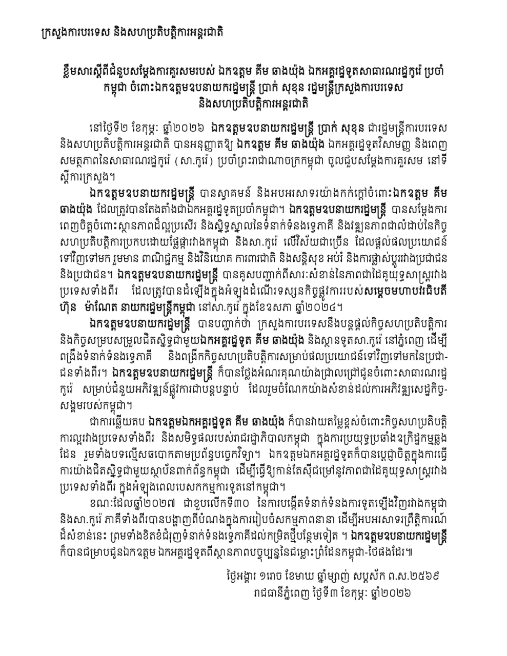 នៅថ្ងៃទី២ ខែកុម្ភៈ ឆ្នាំ២០២៦ ក្រសួងការបរទេស និងសហប្រតិបត្តិការអន្តរជាតិ បានចេញខ្លឹមសារស្តីពីជំនួបសម្តែងការគួរសមរបស់ ឯកឧត្តម គីម ឆាងយ៉ុង ឯកអគ្គរដ្ឋទូតសាធារណរដ្ឋកូរ៉េប្រចាំកម្ពុជា ចំពោះឯកឧត្តមឧបនាយករដ្ឋមន្ត្រី ប្រាក់ សុខុន រដ្ឋមន្ត្រីក្រសួងការបរទេស និងសហប្រតិបត្តិការអន្តរជាតិ។ឯកឧត្តមឧបនាយករដ្ឋមន្ត្រី បានគូសបញ្ជាក់ពីសារៈសំខាន់នៃភាពជាដៃគូយុទ្ធសាស្ត្ររវាងប្រទេសទាំងពីរ ដែលត្រូវបានដំឡើងក្នុងអំឡុងដំណើរទស្សនកិច្ចផ្លូវការរបស់សម្ដេចមហាបវរធិបតី ហ៊ុន ម៉ាណែត នាយករដ្ឋមន្ត្រីកម្ពុជា នៅសាធារណរដ្ឋកូរ៉េ ក្នុងខែឧសភា ឆ្នាំ២០២៤។ ...