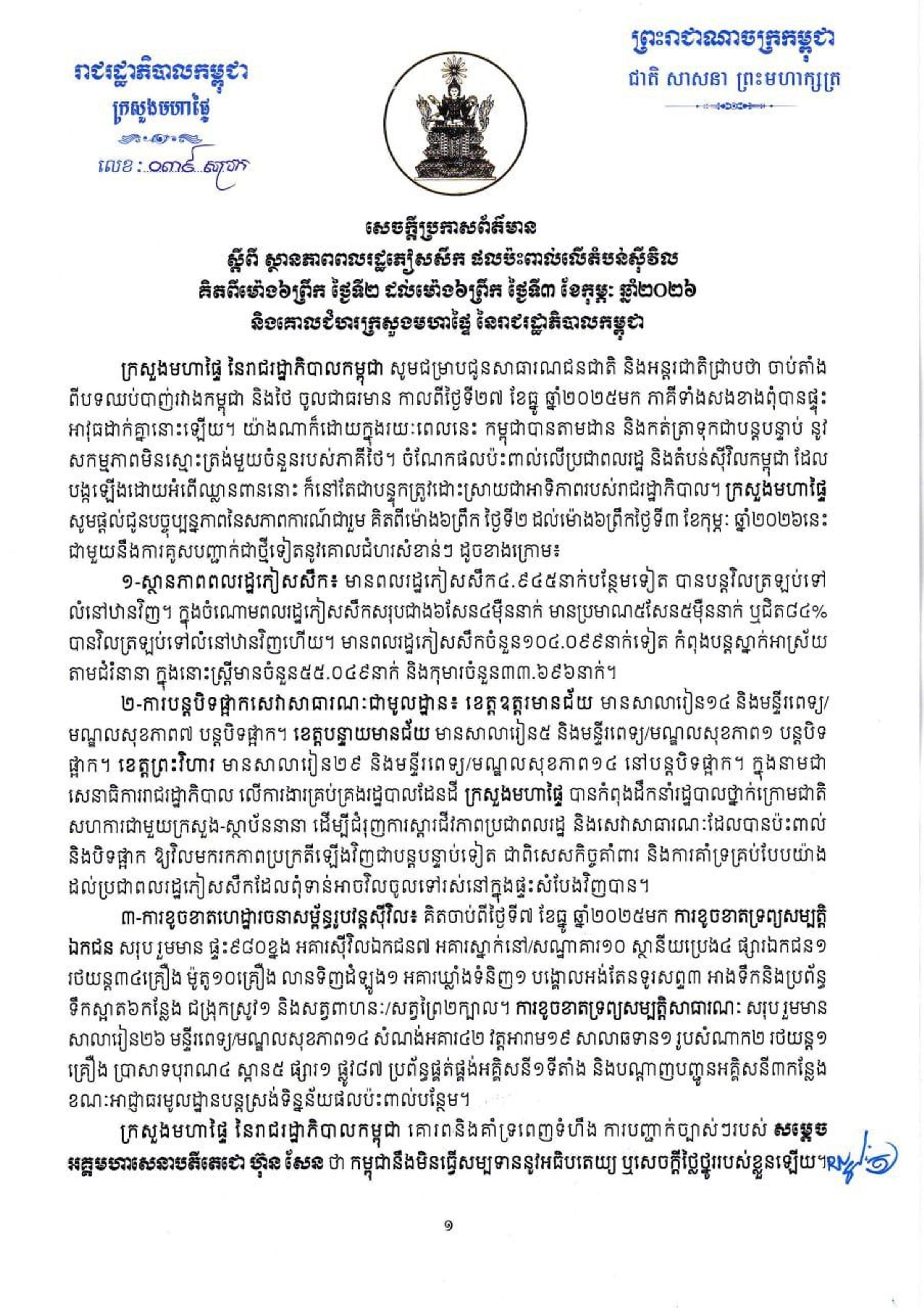 សេចក្ដីប្រកាសព័ត៌មាន៖ ស្ថានភាពពលរដ្ឋភៀសសឹក ផលប៉ះពាល់លើតំបន់ស៊ីវិល គិតពីម៉ោង៦ព្រឹក ថ្ងៃទី១ ខែកុម្ភៈ ដល់ម៉ោង៦ព្រឹក ថ្ងៃទី២ ខែកុម្ភៈ ឆ្នាំ២០២៦ និងគោលជំហរក្រសួងមហាផ្ទៃ នៃរាជរដ្ឋាភិបាលកម្ពុជា