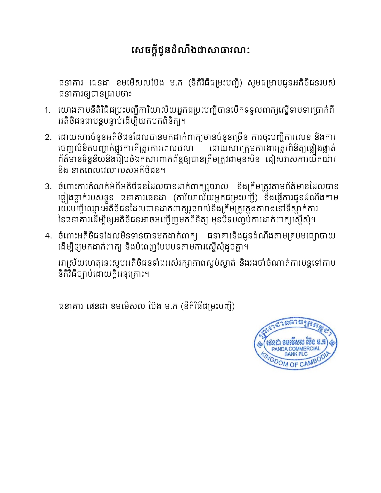 សេចក្តីជូនដំណឹងអំពីនីតិវិធីជម្រះបញ្ចីជូនអតិថិជនរបស់ធនាគារផេនដា