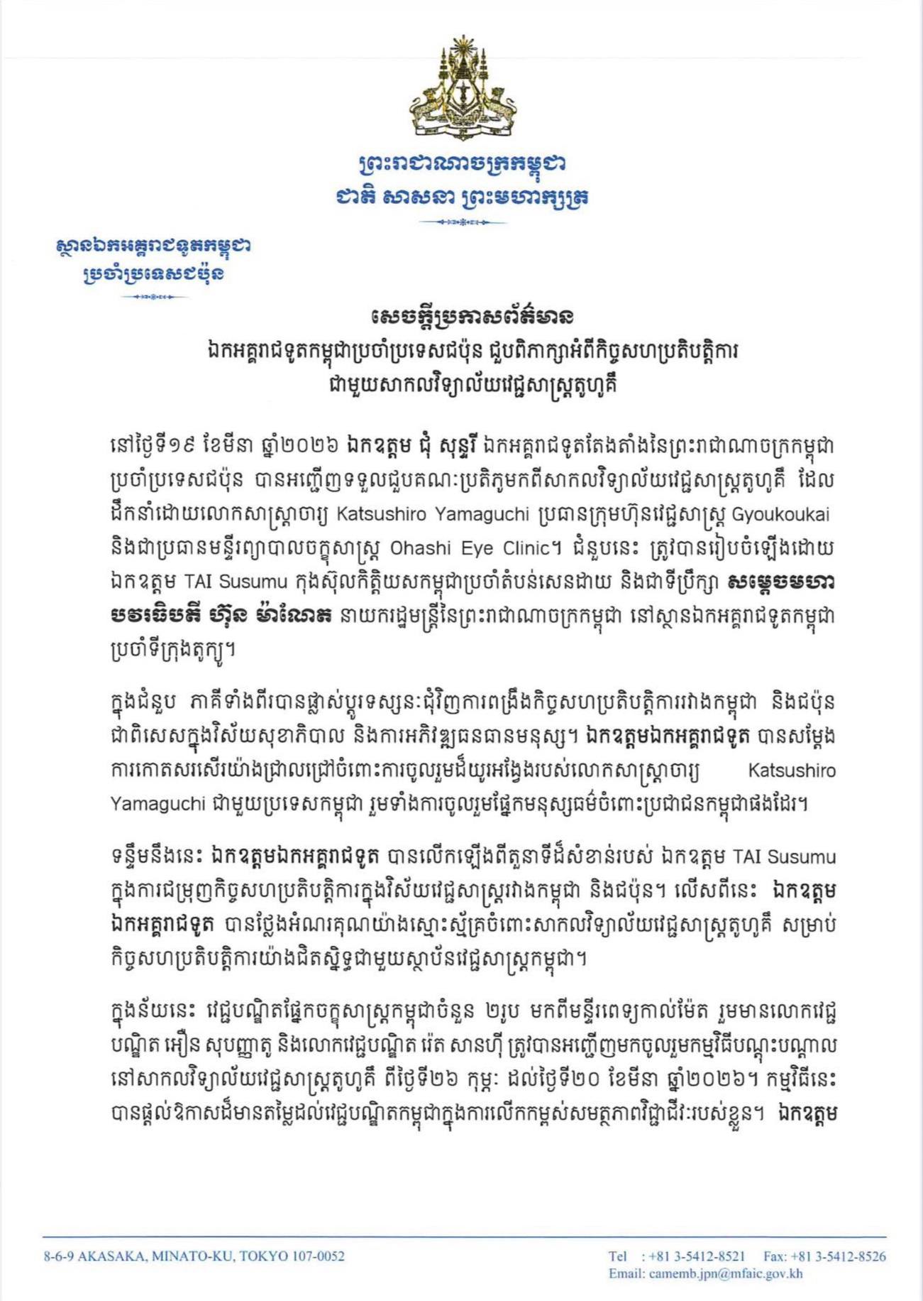 នៅថ្ងៃទី២០ ខែមីនា ឆ្នាំ២០២៦ ស្ថានឯកអគ្គរាជទូតកម្ពុជាប្រចាំប្រទេសជប៉ុនបានចេញសេចក្ដីប្រកាសព័ត៌មានស្តីពី ឯកអគ្គរាជទូតកម្ពុជាប្រចាំប្រទេសជប៉ុន ជួបពិភាក្សាអំពីកិច្ចសហប្រតិបត្តិការ ជាមួយសាកលវិទ្យាល័យវេជ្ជសាស្ត្រតូហូគឹ។ឯកឧត្តម ជុំ សុន្ទរី ឯកអគ្គរាជទូតតែងតាំងនៃព្រះរាជាណាចក្រកម្ពុជា ប្រចាំប្រទេសជប៉ុន បានអញ្ជើញទទួលជួបគណៈប្រតិភូមកពីសាកលវិទ្យាល័យវេជ្ជសាស្ត្រតូហូគី ដែល ដឹកនាំដោយលោកសាស្ត្រាចារ្យ Katsushiro Yamaguchi ប្រធានក្រុមហ៊ុនវេជ្ជសាស្ត្រ Gyoukoukai និងជាប្រធានមន្ទីរព្យាបាលចក្ខុសាស្ត្រ Ohashi Eye Clinic។ ជំនួបនេះ ត្រូវបានរៀបចំឡើងដោយ ឯកឧត្តម TAI Susumu កុងស៊ុលកិត្តិយសកម្ពុជាប្រចាំតំបន់សេនដាយ និងជាទីប្រឹក្សា សម្តេចមហា បវរធិបតី ហ៊ុន ម៉ាណែត នាយករដ្ឋមន្ត្រីនៃព្រះរាជាណាចក្រកម្ពុជា នៅស្ថានឯកអគ្គរាជទូតកម្ពុជា ប្រចាំទីក្រុងតូក្យូ។ ...
