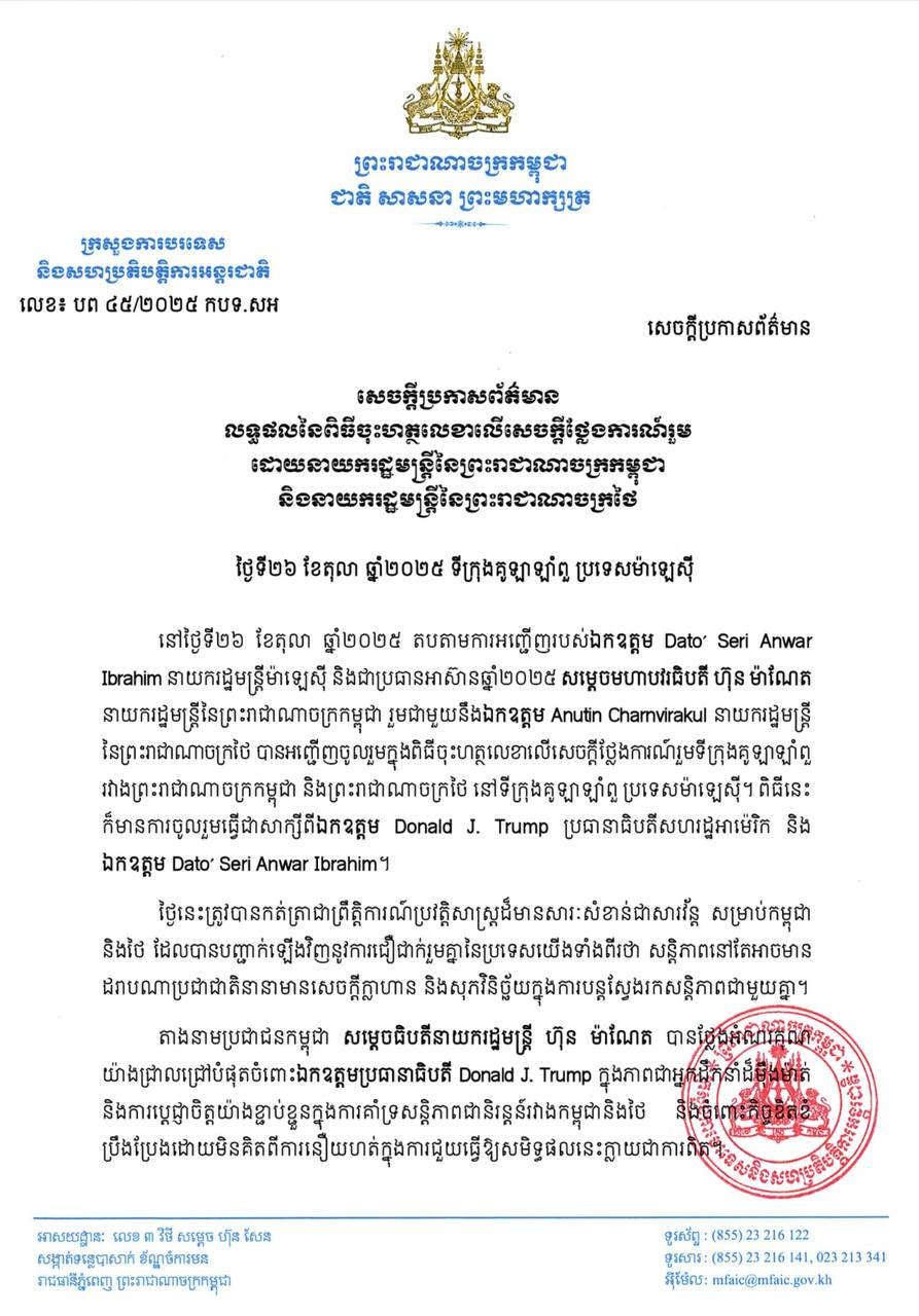 • ​ក្រសួងការបរទេស​ និង​សហប្រតិបត្តិការ​អន្តរជាតិ​នៃ​ព្រះរាជាណាចក្រ​កម្ពុជា​ បាន​ចេញផ្សាយ​សេចក្តី​ប្រកាស​ព័ត៌មាន​លម្អិត​អំពី​ការ​ចុះហត្ថលេខា​លើ​ សេចក្តីថ្លែងការណ៍​រួម​ទីក្រុង​គូ​ឡា​ឡាំ​ពួ​ រវាង​ សម្តេច​ធិ​បតី​ ហ៊ុន​ ម៉ា​ណែ​ត​ នាយក​រដ្ឋមន្ត្រី​នៃ​ព្រះរាជាណាចក្រ​កម្ពុជា​ និង​ ឯកឧត្តម​ Anutin​ Charnvirakul​ នាយក​រដ្ឋមន្ត្រី​នៃ ...