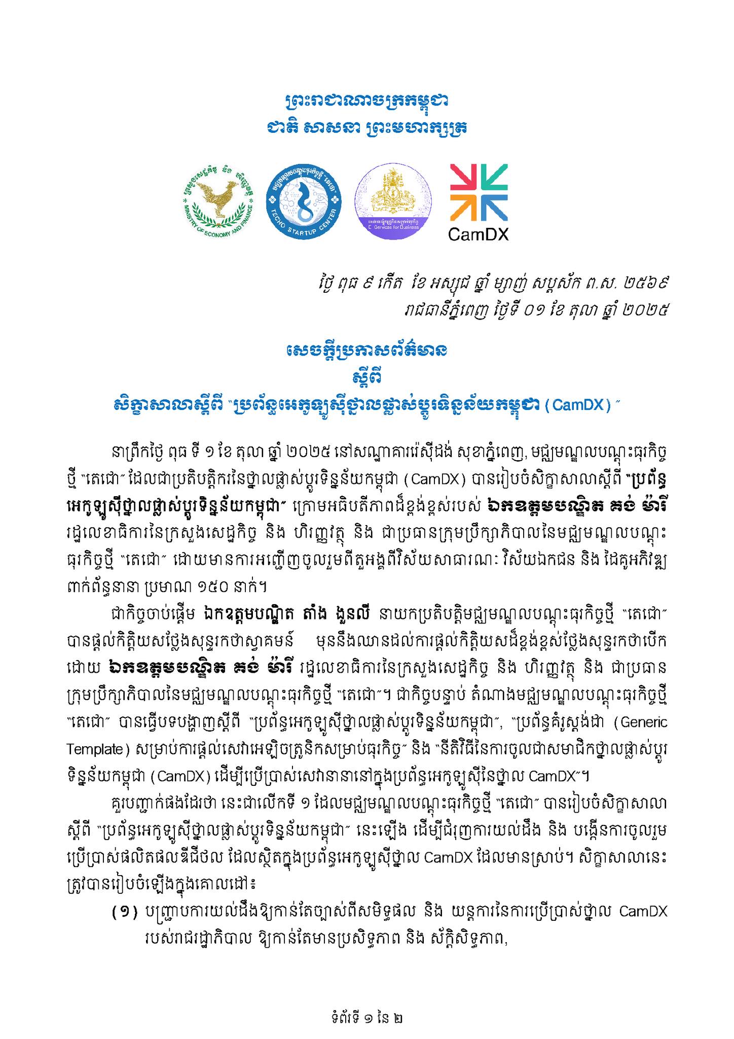 នៅថ្ងៃទី១ ខែតុលា ឆ្នាំ២០២៥ មជ្ឈមណ្ឌលធុរកិច្ចថ្មី”តេជោ” ដែលជាប្រតិបត្តិករនៃថ្នាលផ្លាស់ប្តូរទិន្នន័យកម្ពុជា (CamDX) បានចេញសេចក្តីប្រកាសព័ត៌មានស្តីពីការរៀបចំសិក្ខាសាលាលើកទី១របស់ខ្លួន ស្តីពី “ប្រព័ន្ធ ...