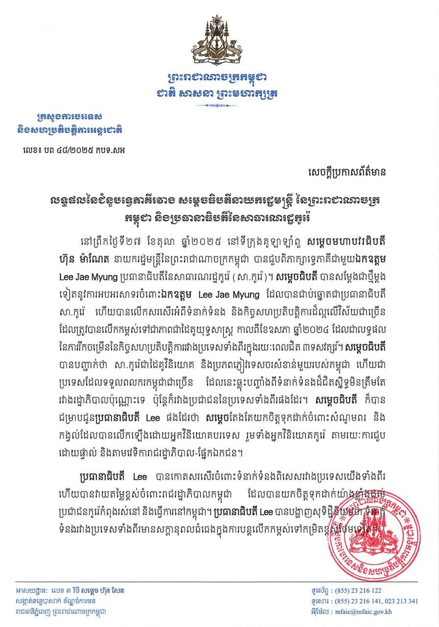 កាលពីថ្ងៃទី២៧ ខែតុលា ឆ្នាំ២០២៥ ក្រសួងការបរទេស និងសហប្រតិបត្តិការអន្តរជាតិ បានចេញផ្សាយសេចក្តីប្រកាសព័ត៌មានស្តីពីលទ្ធផលនៃជំនួបទ្វេភាគីដែលបានប្រព្រឹត្តទៅនៅទីក្រុង គូឡាឡាំពួរ ប្រទេសម៉ាឡេស៊ី រវាងនាយករដ្ឋមន្ត្រីនៃព្រះរាជាណាចក្រកម្ពុជា និងប្រធានាធិបតី ...