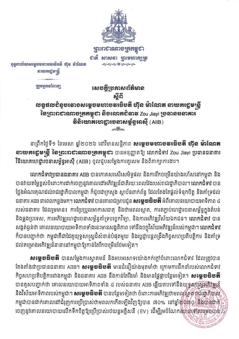 • នៅ​ថ្ងៃ​ទី​២៥​ ខែមីនា​ ឆ្នាំ​២០២៦​ មន្ទីរ​ធនធានទឹក​ និង​ឧតុនិយម​រាជធានី​ភ្នំពេញ​ បាន​ចេញ​សេចក្តីជូនដំណឹង​អំពី​ស្ថានភាព​អាកាសធាតុ​រាជធានី​ភ្នំពេញ​។​​សេចក្តីជូនដំណឹង​នេះ​បាន​បញ្ជាក់​ថា​ ចាប់ពី​ថ្ងៃ​ទី​២៦​ ខែមីនា​ ដល់​ថ្ងៃ​ទី​៧​ ខែមេសា​ ឆ្នាំ​២០២៦​ រាជធានី​ភ្នំពេញ​ នឹង​រង​ឥទ្ធិពល ...