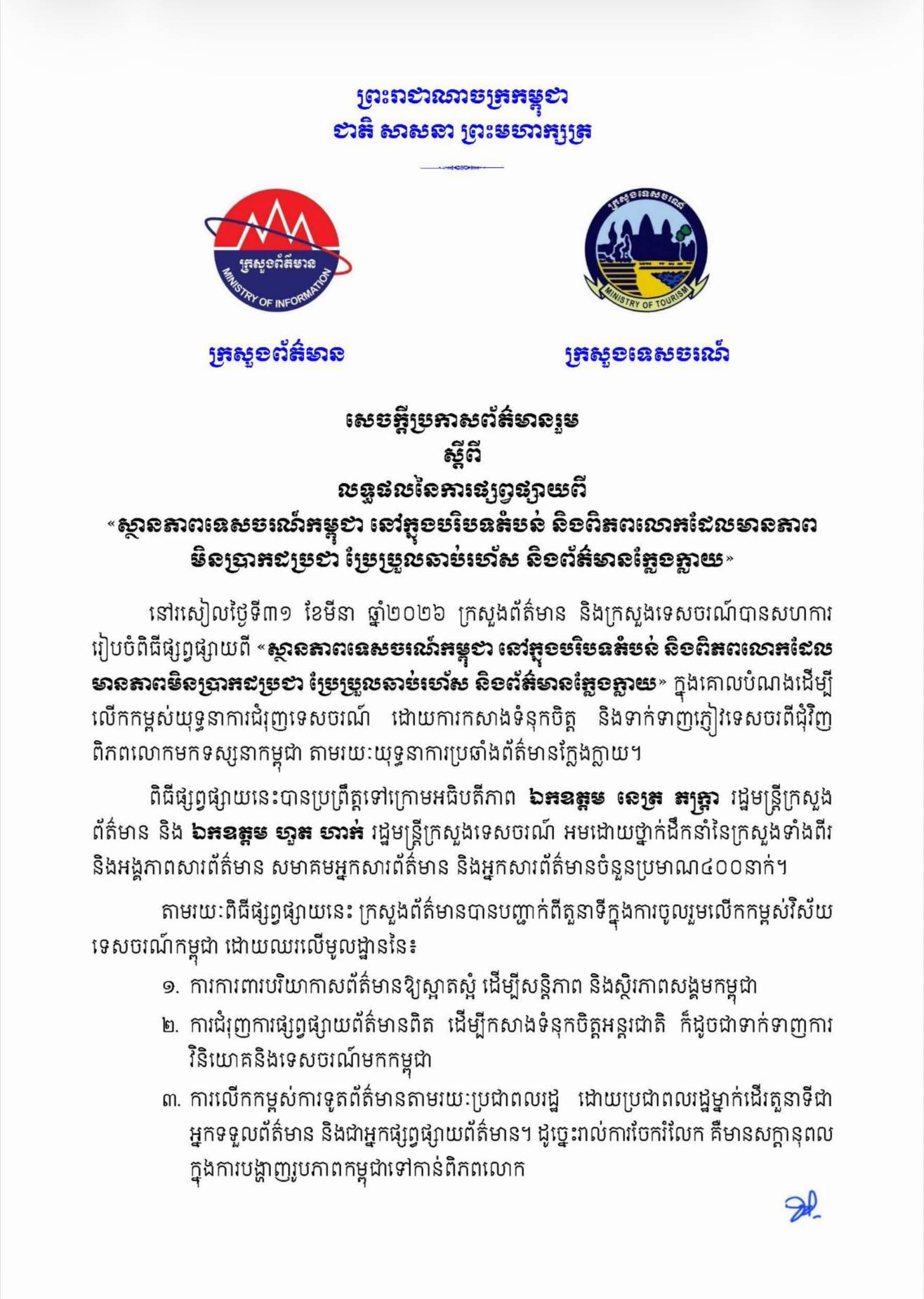• នៅ​ថ្ងៃ​ទី​២៥​ ខែមីនា​ ឆ្នាំ​២០២៦​ មន្ទីរ​ធនធានទឹក​ និង​ឧតុនិយម​រាជធានី​ភ្នំពេញ​ បាន​ចេញ​សេចក្តីជូនដំណឹង​អំពី​ស្ថានភាព​អាកាសធាតុ​រាជធានី​ភ្នំពេញ​។​​សេចក្តីជូនដំណឹង​នេះ​បាន​បញ្ជាក់​ថា​ ចាប់ពី​ថ្ងៃ​ទី​២៦​ ខែមីនា​ ដល់​ថ្ងៃ​ទី​៧​ ខែមេសា​ ឆ្នាំ​២០២៦​ រាជធានី​ភ្នំពេញ​ នឹង​រង​ឥទ្ធិពល ...