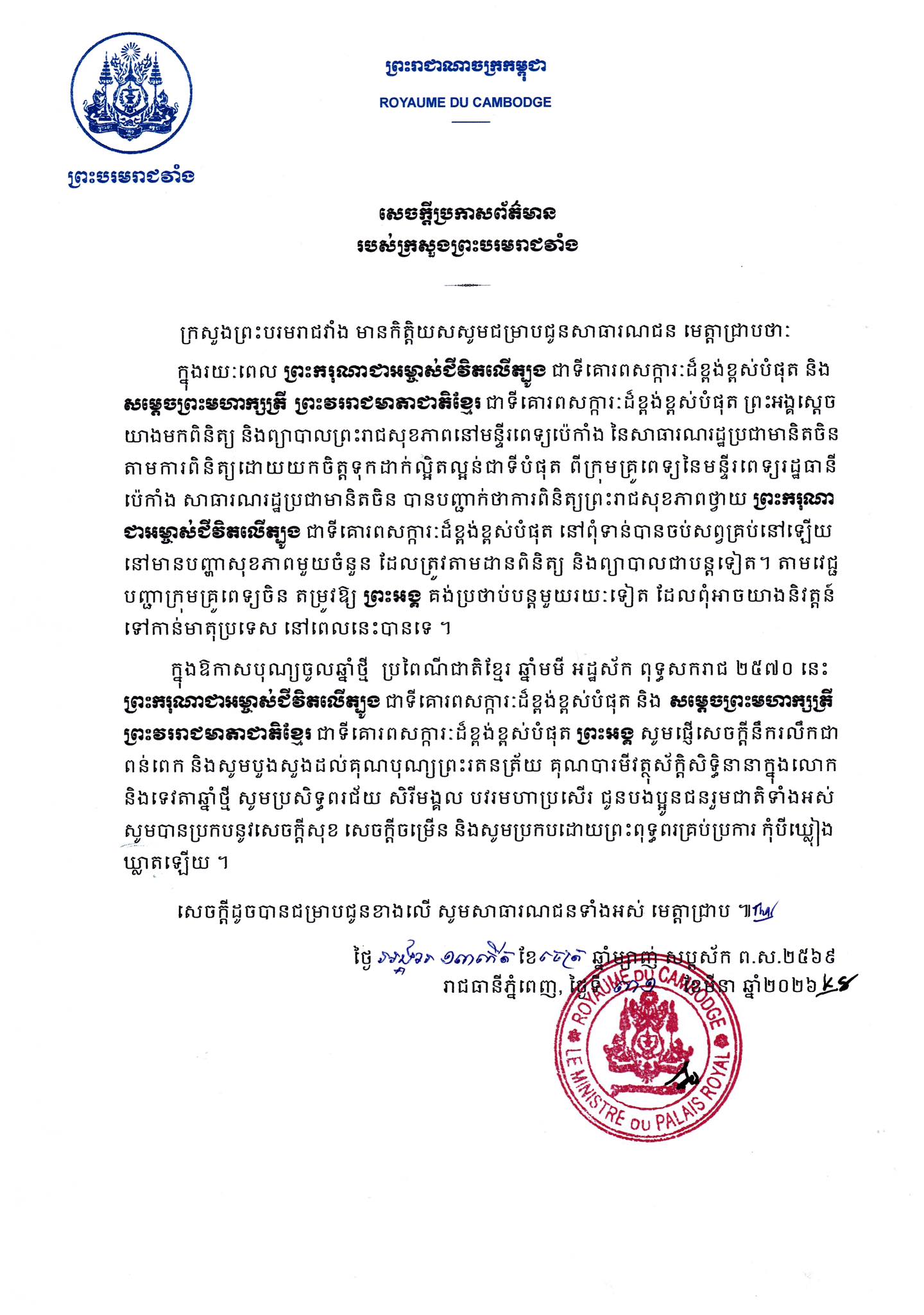 នៅថ្ងៃទី៣១ ខែមីនា ឆ្នាំ២០២៦ ក្រសួងព្រះបរមរាជវាំង បានចេញសេចក្ដីប្រកាសព័ត៌មានស្តីពីព្រះករុណាជាអម្ចាស់ជីវិតលើត្បូង និងសម្តេចព្រះមហាក្សត្រី។សេចក្ដីប្រកាសនេះបានបញ្ជាក់ថា ព្រះករុណាជាអម្ចាស់ជីវិតលើត្បូង និងសម្តេចព្រះមហាក្សត្រី ព្រះវររាជមាតាជាតិខ្មែរ កំពុងស្ថិតនៅមន្ទីរពេទ្យប៉េកាំង ...