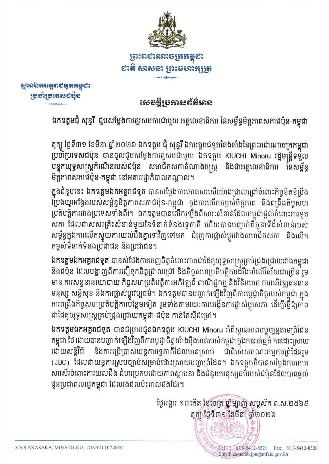 នៅថ្ងៃទី៣១ ខែមីនា ឆ្នាំ២០២៦ ស្ថានឯកអគ្គរាជទូតកម្ពុជា ប្រចាំប្រទេសជប៉ុន បានចេញសេចក្តីប្រកាសព័ត៌មានស្តីពី ឯកឧត្តមជុំ សុន្ទរី ជួបសម្ដែងការគួរសមការជាមួយ អគ្គលេខាធិការ នៃសម្ព័ន្ធមិត្តភាពសភាជប៉ុន-កម្ពុជា។សេចក្តីប្រកាសនេះបានបញ្ជាក់ថា ឯកឧត្តម ជុំ ...