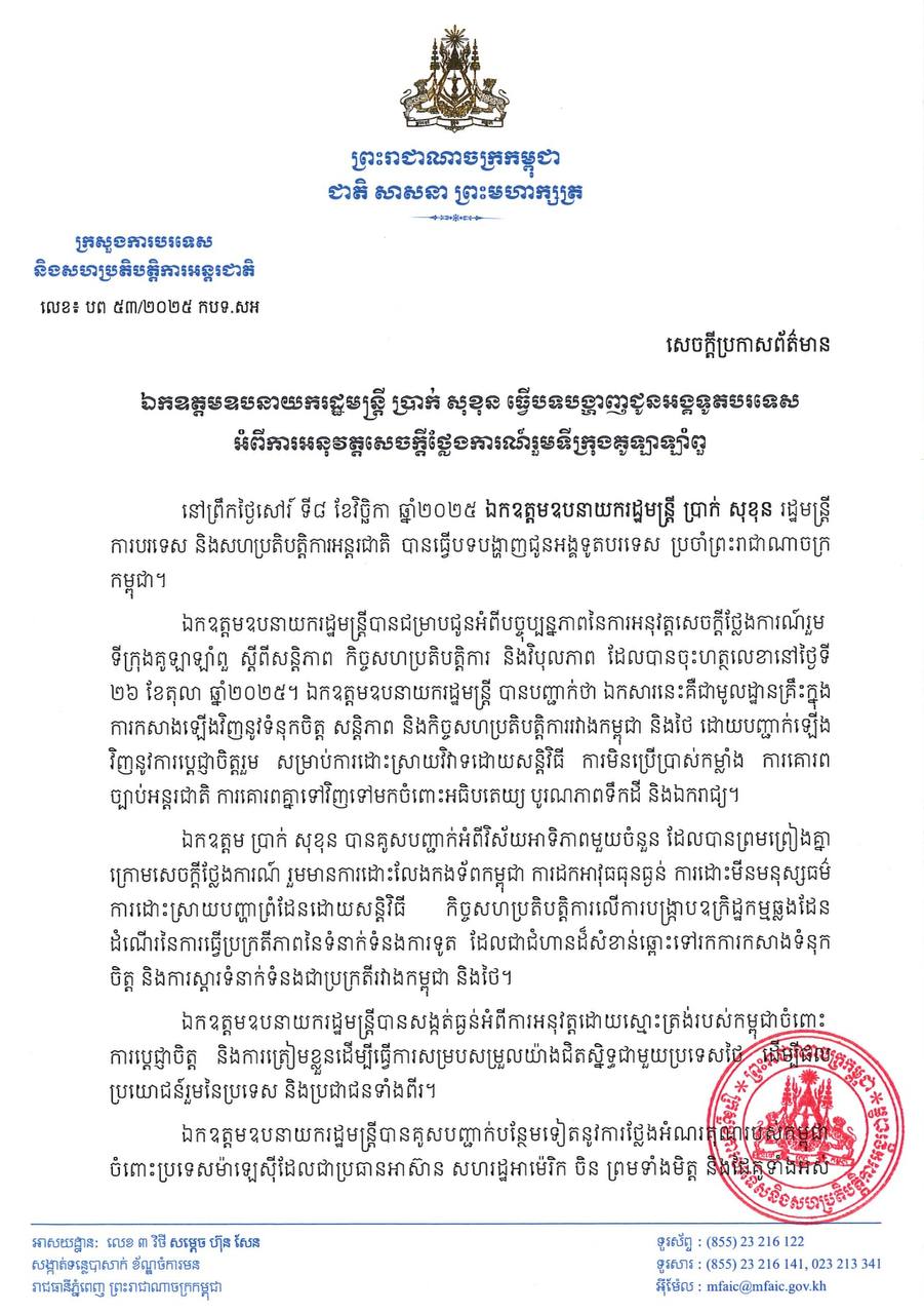 នៅថ្ងៃទី៨ ខែវិច្ឆិកា ឆ្នាំ២០២៥ ឯកឧត្តមឧបនាយករដ្ឋមន្ត្រី ប្រាក់ សុខុន បានធ្វើបទបង្ហាញសង្ខេបជូនអង្គទូតបរទេស ប្រចាំព្រះរាជាណាចក្រកម្ពុជា អំពីបច្ចុប្បន្នភាពនៃការអនុវត្តសេចក្តីថ្លែងការណ៍រួមទីក្រុងកូឡាឡាំពួរ រវាង កម្ពុជា និងថៃ ។ សេចក្តីថ្លែងការណ៍នេះ ដែលត្រូវ ...