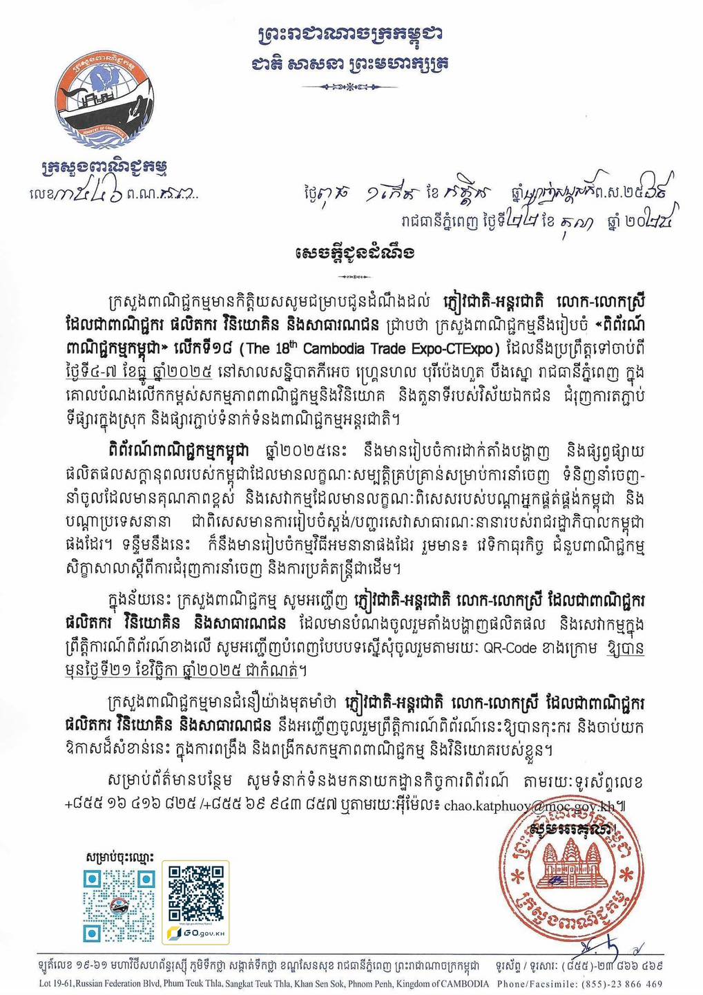 នៅថ្ងៃទី២២ ខែតុលា ឆ្នាំ២០២៥ ក្រសួងពាណិជ្ជកម្ម បានចេញសេចក្តីជូនដំណឹង ស្តីពី ការរៀបចំ «ពិព័រណ៍ពាណិជ្ជកម្មកម្ពុជា» លើកទី១៨ (The 18th Cambodia Trade Expo-CTExpo) ពីថ្ងៃទី៤-៧ ខែធ្នូ ឆ្នាំ២០២៥ នៅសាលសន្និបាតភីអេច ហ្គ្រេនហល បុរីប៉េងហួត បឹងស្នោ រាជធានីភ្នំពេញ ក្នុងគោលបំណងលើកកម្ពស់សកម្មភាពពាណិជ្ជកម្មនិងវិនិយោគ និងតួនាទីរបស់វិស័យឯកជន ជំរុញការតភ្ជាប់ទីផ្សារក្នុងស្រុក និងផ្សារភ្ជាប់ទំនាក់ទំនងពាណិជ្ជកម្មអន្តរជាតិ។ ...