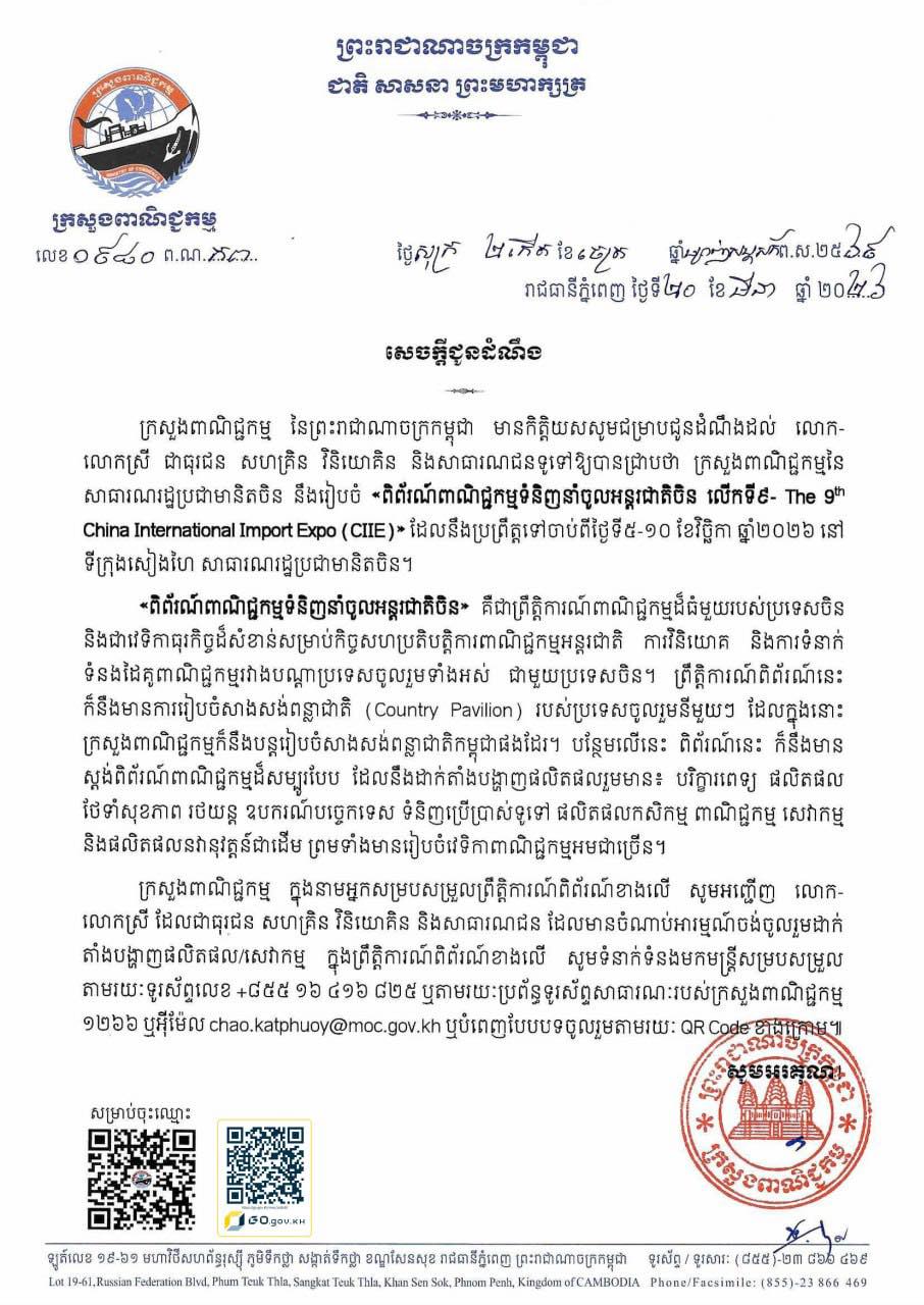 នៅថ្ងៃទី២០ ខែមីនា ឆ្នាំ២០២៦ ក្រសួងពាណិជ្ជកម្មបានចេញសេចក្តីជូនដំណឹងស្តីពីពិព័រណ៍នាំចូលអន្តរជាតិចិនលើកទី៩ (CIIE)។ក្រសួងពាណិជ្ជកម្មនៃព្រះរាជាណាចក្រកម្ពុជាមានកិត្តិយសជម្រាបជូនដល់ពាណិជ្ជករ សហគ្រិន អ្នកវិនិយោគ និងសាធារណជនទាំងអស់ឱ្យបានជ្រាបថា ក្រសួងពាណិជ្ជកម្មនៃសាធារណរដ្ឋប្រជាមានិតចិនកំពុងរៀបចំ ...