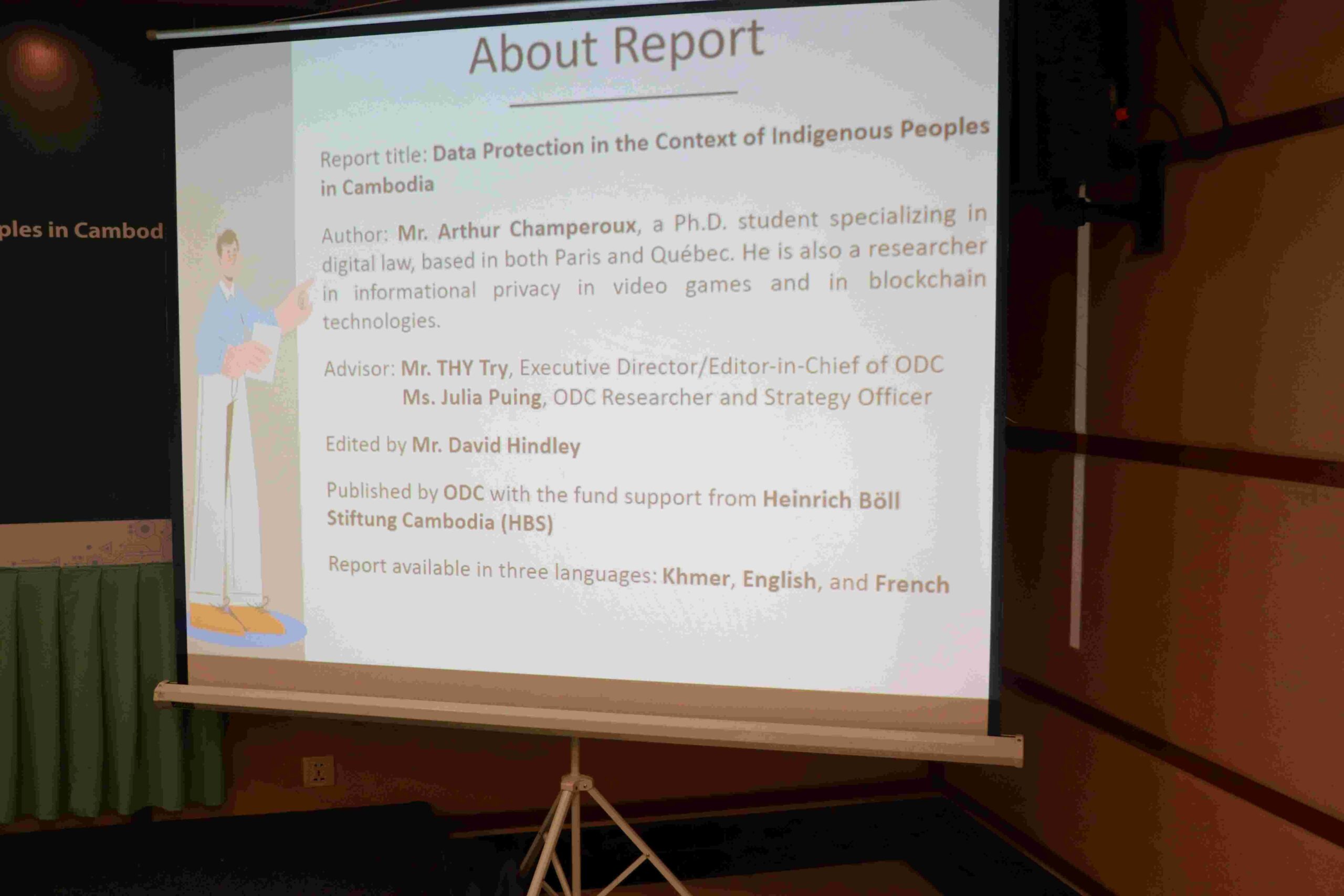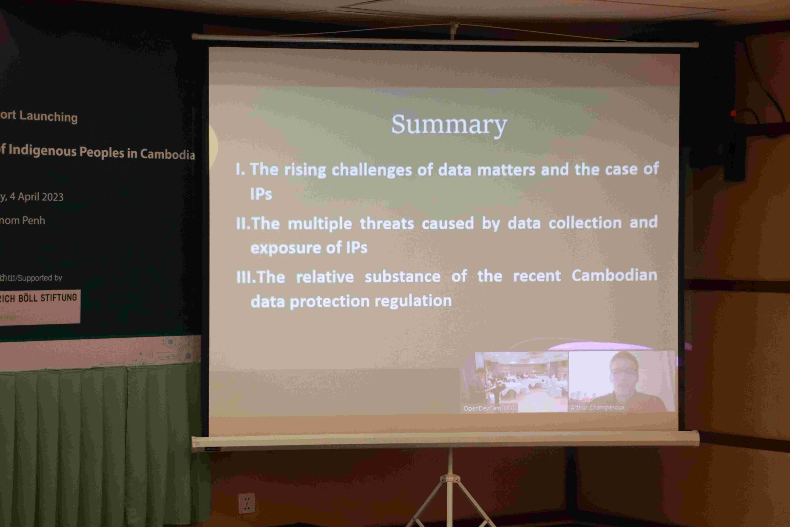 របៀបវារៈសំខាន់មួយទៀតនៃកម្មវិធីនេះ គឺបទបង្ហាញរបស់លោក Arthur Champeroux ដែលជាអ្នកសរសេររបាយការណ៍នេះផ្ទាល់។ បទបង្ហាញនេះផ្តោតសំខាន់លើស្ថានភាពបច្ចុប្បន្ននៃការការពារទិន្នន័យនៅក្នុងប្រទេសកម្ពុជា ជាពិសេសក្នុងចំណោមជនជាតិដើមភាគតិច។ លើសពីនោះ គាត់បានរកឃើញក្របខ័ណ្ឌ និងគោលនយោបាយច្បាប់គួរឱ្យចាប់អារម្មណ៍មួយចំនួនទាក់ទងនឹងទិន្នន័យ និងការការពារឯកជនភាពនៅកម្ពុជា ដូចជាសេចក្តីព្រាងច្បាប់ស្តីពីសន្តិសុខអ៊ីនធឺណិត។ គាត់បានសង្កេតឃើញចលនារបស់អង្គការមិនមែនរដ្ឋាភិបាលមួយចំនួនដែលធ្វើការក្នុងវិស័យការពារទិន្នន័យជនជាតិដើមភាគតិច។ ទោះយ៉ាងណាក៏ដោយ បទប្បញ្ញត្តិទិន្នន័យ និងការការពារឯកជនភាពសម្រាប់ជនជាតិដើមភាគតិចចាំបាច់ត្រូវតែមានតុល្យភាព។ ប្រទេសកម្ពុជាមិនទាន់មានការការពារទិន្នន័យរដ្ឋបាល ឬបទប្បញ្ញត្តិដែលការពារទិន្នន័យជនជាតិដើមភាគតិច និងឯកជនភាពនៅឡើយទេ។ សេចក្តីព្រាងច្បាប់ស្តីពីសុវត្ថិភាពអ៊ីនធឺណិតអាចបំភ្លឺខ្លះៗអំពីទិន្នន័យ និងការការពារឯកជនភាព។